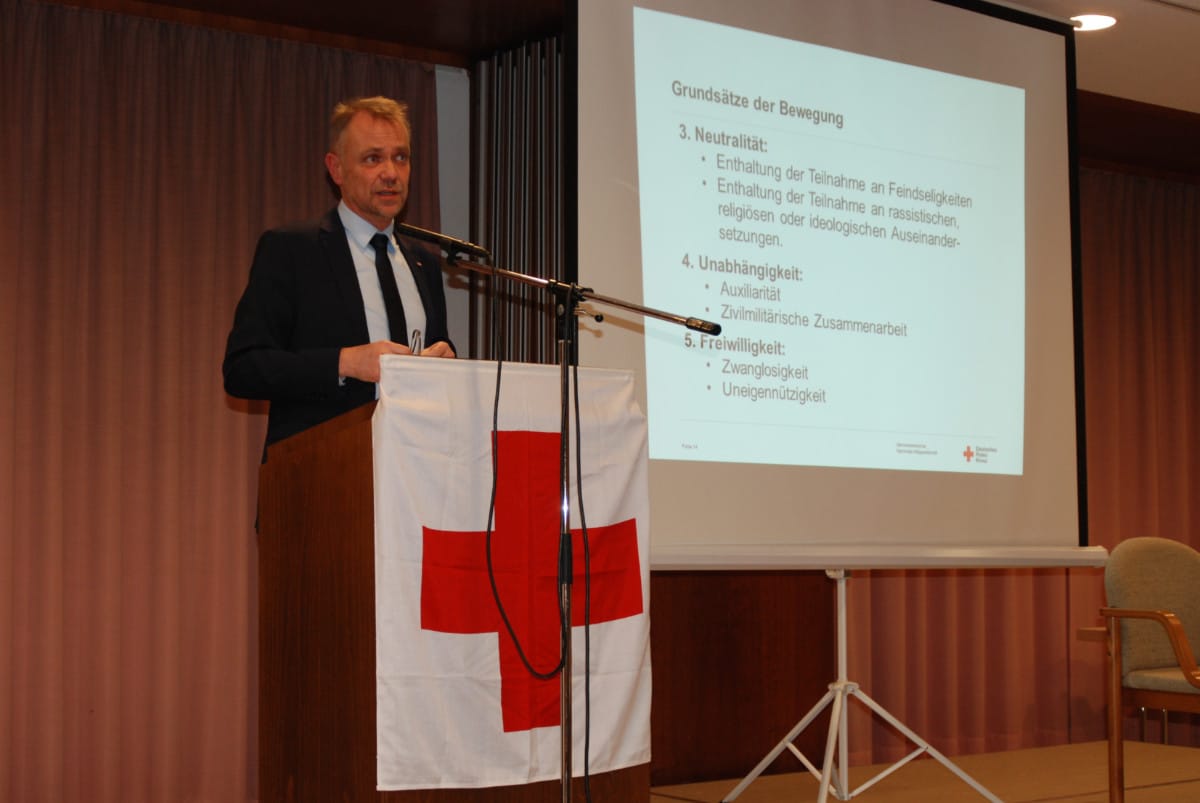 „Das Rote Kreuz hat gegenüber den Regierungen eine Sonderstellung, denn wir sind eine Verpflichtung zur Zusammenarbeit mit den nationalen Behörden eingegangen“, erinnerte Schön weiter. Diese beziehe sich nicht nur auf Hilfe bei Kriegen sondern umfasse die Katastrophenhilfe sowie soziale und humanitäre Aufgaben. Dazu zählen beispielsweise das Blutspendewesen, der Rettungsdienst, die Altenpflege oder der Auskunftsdienst bei Katastrophen. „Aber wir überprüfen vor jeder Anfrage auf humanitäre Hilfe, ob diese mit unseren Grundsätzen vereinbar ist“, stellte der Vizepräsident klar.