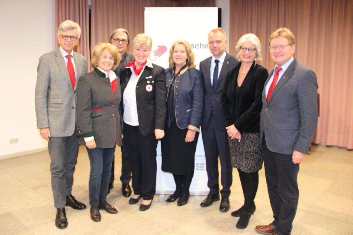 International besetzt war die Riege der Referenten auf der Bezirksversammlung des BRK Schwaben anlässlich des Tags des Ehrenamtes. Im Bild von links: Dr. Werner Kerschbaum (Generalsekretär des Österreichischen Roten Kreuzes, Wien), Christa Prinzessin von Thurn und Taxis (Ehrenpräsidentin BRK), Dr. Andreas Ennulat (Vizepräsident des Dunant-Museums in Heiden, Schweiz), Angelika Schorer (Vorstandsvorsitzende des BRK Bezirksverbands Schwaben), Barbara Strobel (Vorsitzende des BRK Kreisverbands Ostallgäu), Dr. Volkmar Schön (Vizepräsident des DRK, Berlin), Brigitte Meyer (Vizepräsidentin BRK), Dr. Paul Wengert (Vizepräsident BRK).