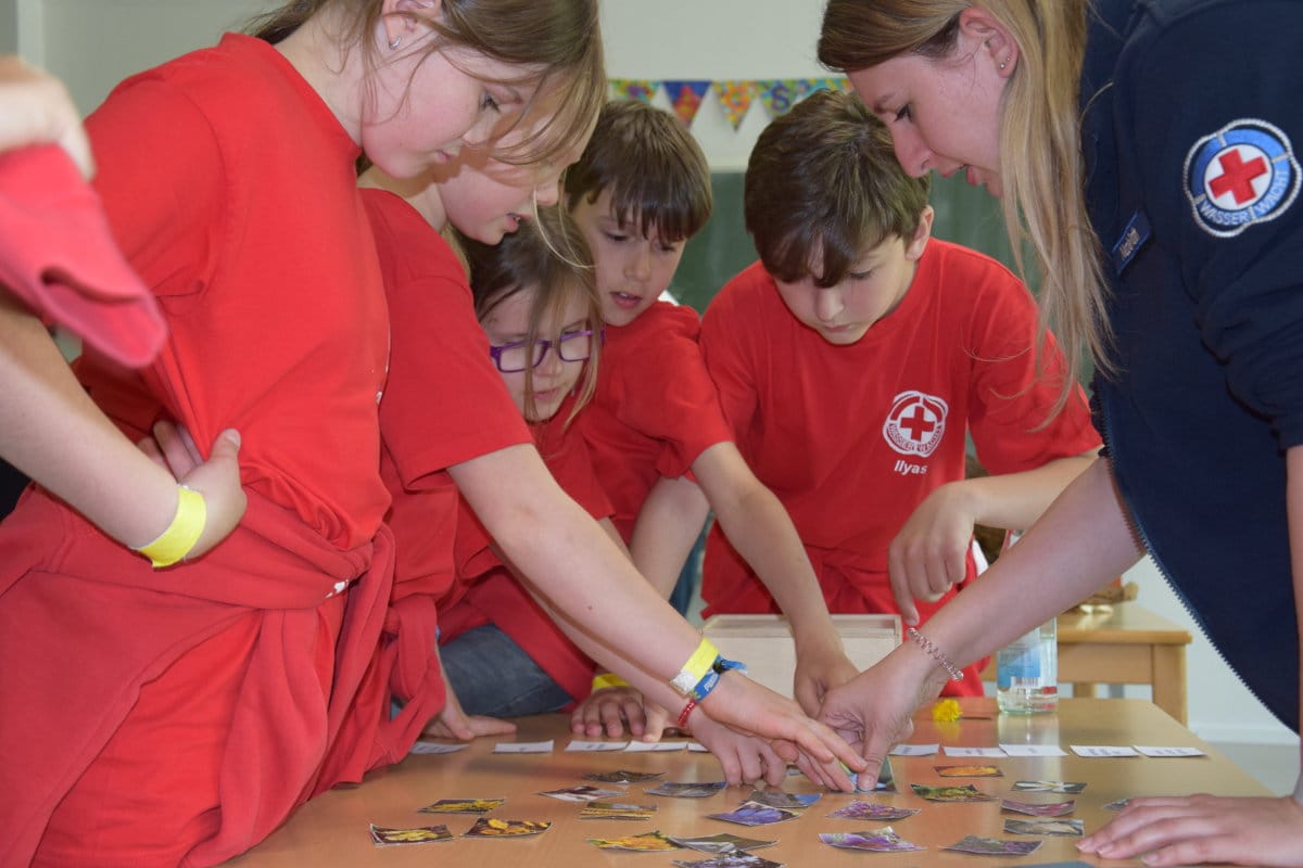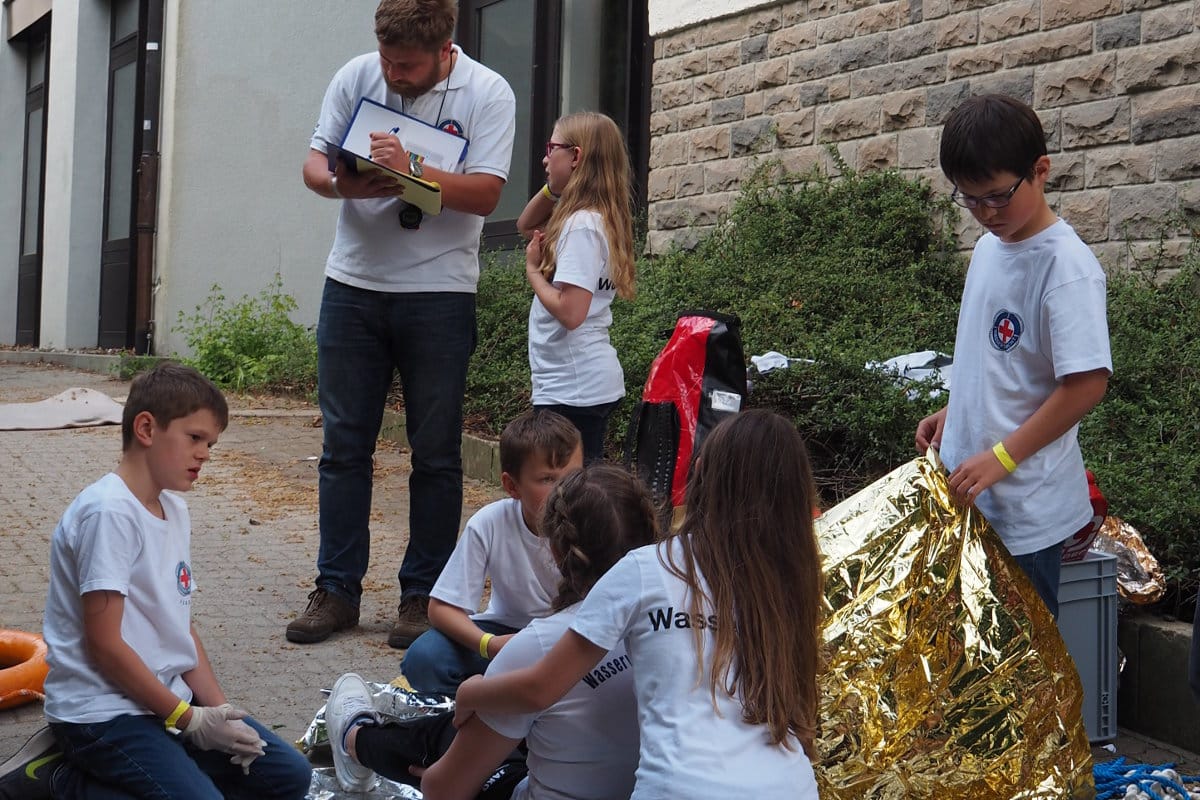 Die Klassenzimmer und das Schulgelände verwandelten sich am Wettkampftag in Prüfungsräume für Theorie-, Fertigkeits- und Erste Hilfe-Prüfungen. So mussten die jungen Wasserwachtler in den Klassenräumen etwa zeigen, wie sie mit Schnitten, Schürfwunden oder bewusstlosen Personen umgingen. Unter den Blicken der Prüfer mussten sie Verbände und Pflaster anlegen und wissen, was bei einem Notruf wichtig ist. Auf dem Schulgelände wurden Rettungs-Situationen nachgestellt. Etwa ein Wadenkrampf bei einer hilflosen Person im Wasser, die dann in Teamarbeit gerettet und versorgt werden musste.