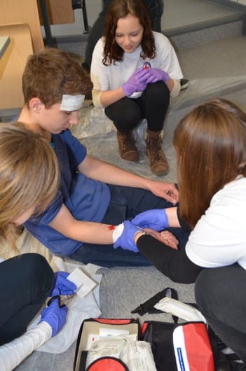Bei den Sachkundefragen stand heuer das Thema „Wald“ im Mittelpunkt. Welche Tiere gibt es in Wald und Wasser? Welche Pflanzen gibt es dort? Wer von den Kindern und Jugendlichen hier Bescheid wusste, konnte seiner Ortsgruppe wichtige Punkte sichern. Der Schwierigkeitsgrad der Fragen richtete sich nach den verschiedenen Altersgruppen. Dramatisch wurde es dann beim Bereich praktische Erste Hilfe: Aufwändig geschminkt und im Rahmen realistisch dargestellter Unfallszenarien warteten die „Opfer“ auf ihre Retter. Im Gemeinschaftsarbeit entschieden schon die Jüngsten, ob ein Pflaster geklebt, eine Wärmedecke umgelegt oder der Puls gemessen werden musste. Stets an der Seite der Kinder und Jugendlichen waren dabei ihre Betreuer sowie die Jury, die nicht zuletzt das korrekte Abgeben eines Notrufs bewertete.