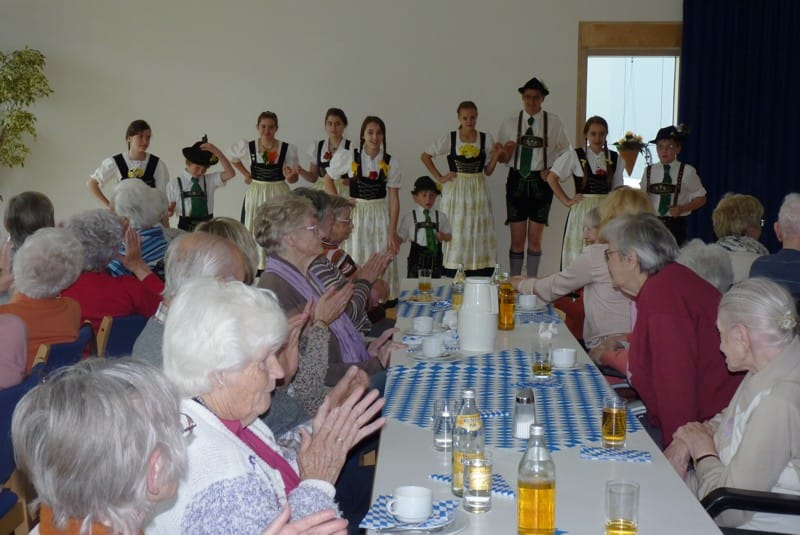 Zum Maibaum aufstellen gehört natürlich auch eine echte Feier. Angesichts des schlechten Wetters musste diese zwar nach innen verlegt werden, doch die Jugendgruppe des Marktoberdorfer Trachtenvereins „D’Wertachtaler“ begeisterte die Seniorinnen und Senioren mit verschiedenen Tänzen und einem zünftigen Schuhplattler.