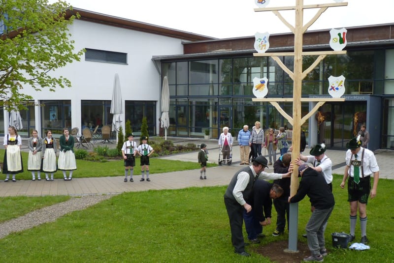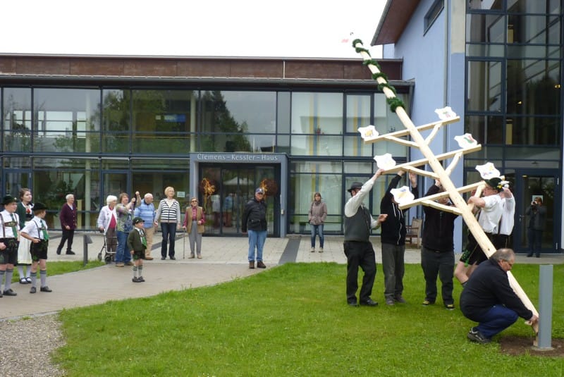 Im Anschluss errichteten die Mitglieder der Marktoberdorfer Trachtengruppe D’Wertachtaler, der „Vater“ des Maibaums und weitere Helfer aus dem Clemens-Kessler-Haus mit vereinten Kräften das neue Wahrzeichen am Vorplatz des Heims.