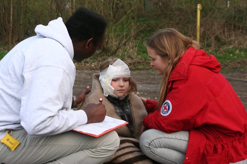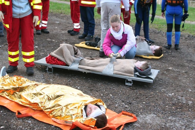 „Da ich die Einsatzleiterin war, musste ich während der Fahrt schon voraus planen, wer wann wo in welchem Team ist. Ich durfte sogar vorne sitzen und eine blaue Einsatzleiter-Weste tragen, dank der mich alle respektierten und sogar die Erwachsenen getan haben, was ich ihnen gesagt habe“, berichtet Sophie weiter: „Als wir dann ankamen, war ich aber erst mal total überfordert“. Die Rolle der Mutter wurde gut gespielt: „Sie hat sich über alles beschwert, war total hysterisch. Als wir ihr jedoch versicherten, dass man bereits nach ihren Kindern suche, war sie soweit beruhigt, dass ich mich um die Einteilung der Sani-Teams kümmern konnte“, fand sich Sophie schnell in ihre Aufgabe ein. Jugendleiter Beelte erklärt: „Das sind genau die Dinge, die sich nur in einer solchen realitätsnahen Übung vermitteln lassen – dass es nicht nur auf gute Erste-Hilfe-Kenntnisse ankommt, sondern ebenso auf psychologisches Geschick, den Umgang mit den Beteiligten des Notfalls und die Routine, in einer chaotischen Situation den ruhigen Überblick zu behalten“.