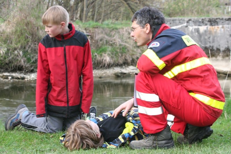Eine aufgelöste Mutter, die ihr Kind am Flussufer verloren hat, ein Jugendlicher, der plötzlich zusammenbricht und sich übergeben muss: Das sind Situationen, bei denen selbst die meisten Erwachsenen mit einer Hilfeleistung überfordert wären. Bei der Frühjahrsübung der SEG (Schnelleinsatzgruppe), die die Kaufbeurer Wasserwacht kürzlich speziell für ihre jugendlichen Mitglieder organisiert hat, mussten die Nachwuchs-Wasserretter sich jedoch genau mit solchen Fällen befassen. Am Wehr in der Schelmenhofstraße simulierten aufwändig vorbereitete Mimen „echte“ Notfälle. „Und das haben sie richtig toll gemacht“, resümiert Jugendleiter Torsten Beelte. Auch der technische Leiter Thomas Amm war mehr als zufrieden über die Leistung der Jugendlichen.