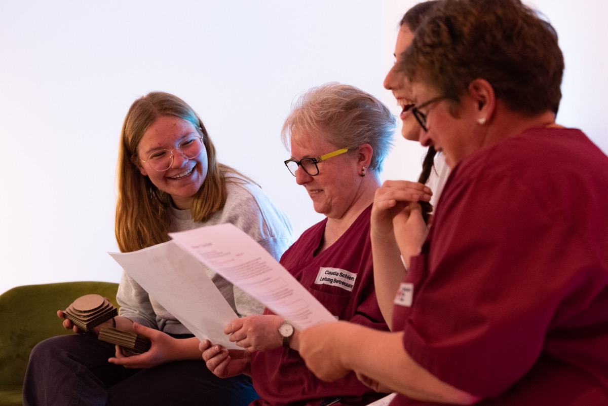 Schon der erste Kennenlern-Besuch im Pflegeheim im Herbst war für die 11.-Klässler inspirierend: Sie erlebten, wie Bewohner zusammen mit Grundschulkindern eine triste Wand in ein farbenfrohes Kunstwerk verwandelten. „Es war beeindruckend zu sehen, wie Alt und Jung gemeinsam lachende Gesichter mit bunten Farben erschaffen haben“, so Lara Ried. Überrascht war die Gymnasiastin auch über die große Anzahl an Angeboten, von einem Entspannungsbad über den hauseigenen Friseur bis hin zu „UTI“, einem interaktiven Bildschirm, auf dem man unter anderem Schach spielen kann.