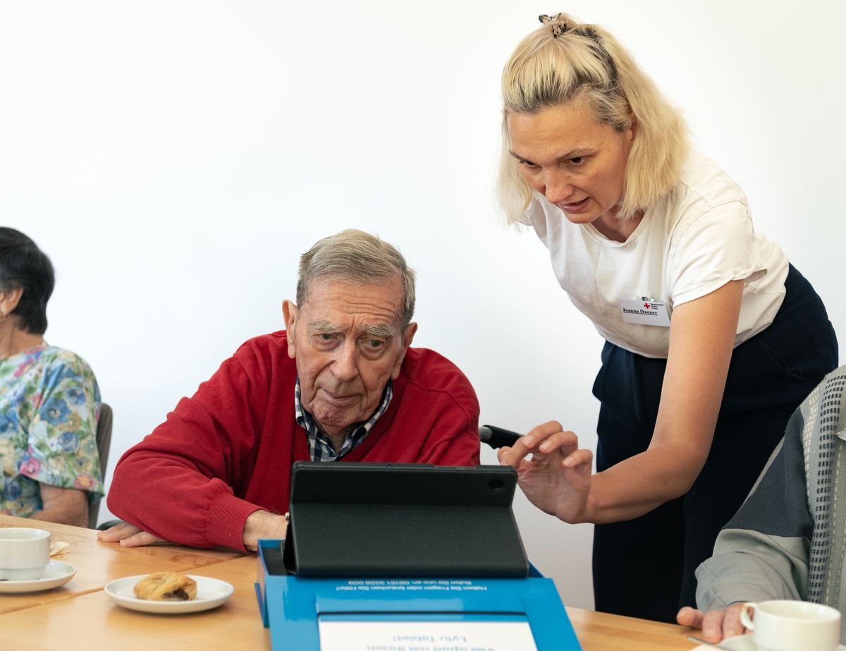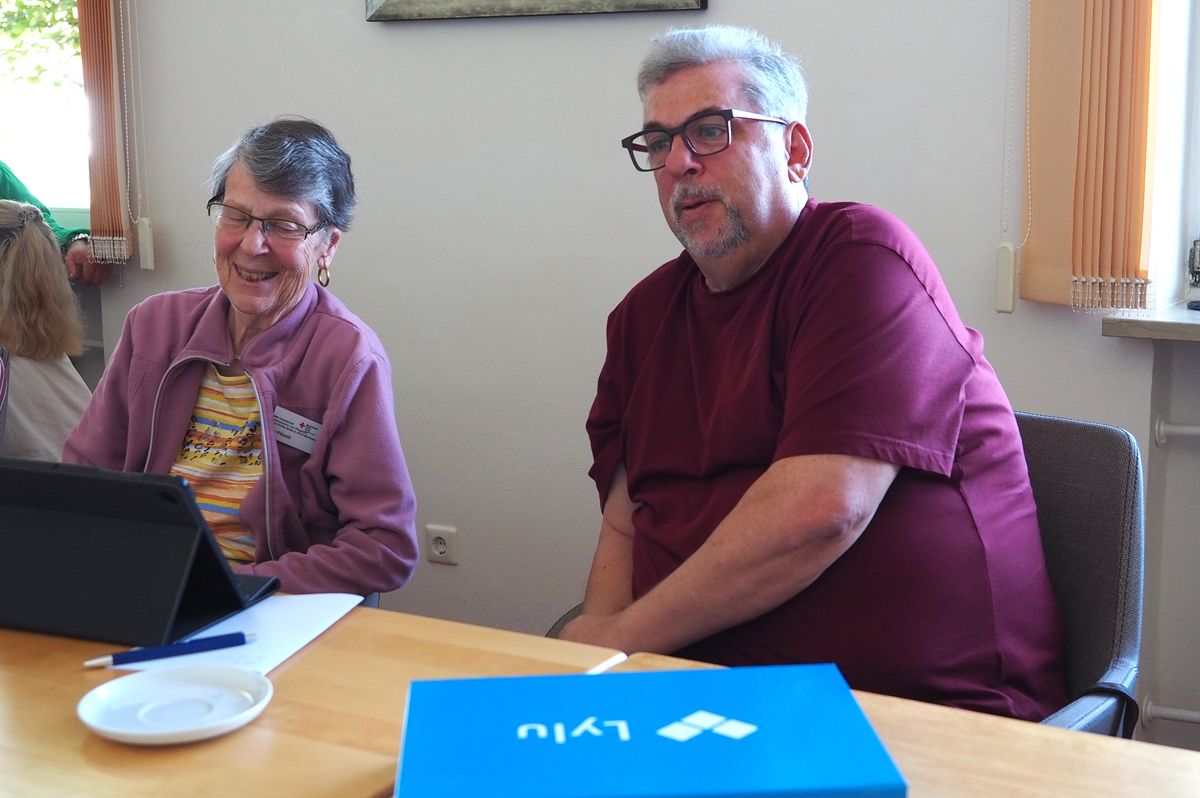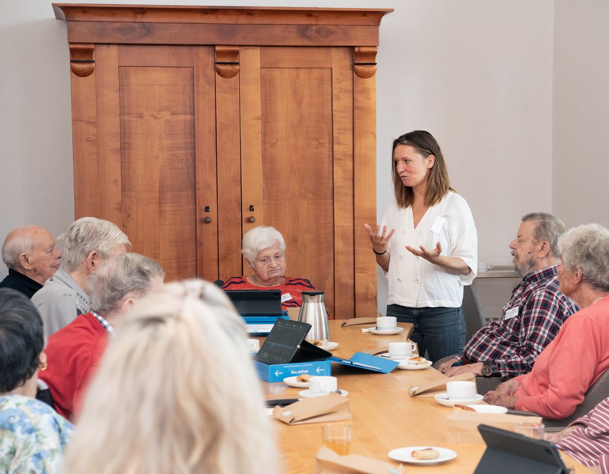 Auslöser des Projekts war eigentlich die Corona-Pandemie, führte Daniel Kahl bei der Infoveranstaltung im Gulielminetti-Haus ein. Jüngere Menschen hatten es damals leichter gehabt, durch technische Möglichkeiten in Kontakt mit Familie und Freunden zu bleiben. „Alleinlebende Ältere und Bewohnern von Einrichtungen blieben diese Kontaktmöglichkeiten aus verschiedensten Gründen verwehrt“, so der Pflegedienstleiter. Er und Kollegin Claudia Schien, Leitung der Sozialen Betreuung, sind in der Rotkreuz-Einrichtung die verantwortlichen Ansprechpartner für das Projekt von Professorin Joanna Dauner. Sie lehrt an der Hochschule Dresden Grundlagen der Gestaltung an der Fakultät Design. Das dreijährige Forschungsvorhaben von Professorin Dauner und ihrer wissenschaftlichen Mitarbeiterin Katrin Baumgarten hat zum Ziel, die soziale Teilhabe der Gruppe der Älteren durch geeignete Kommunikationsmöglichkeiten zu verbessern.