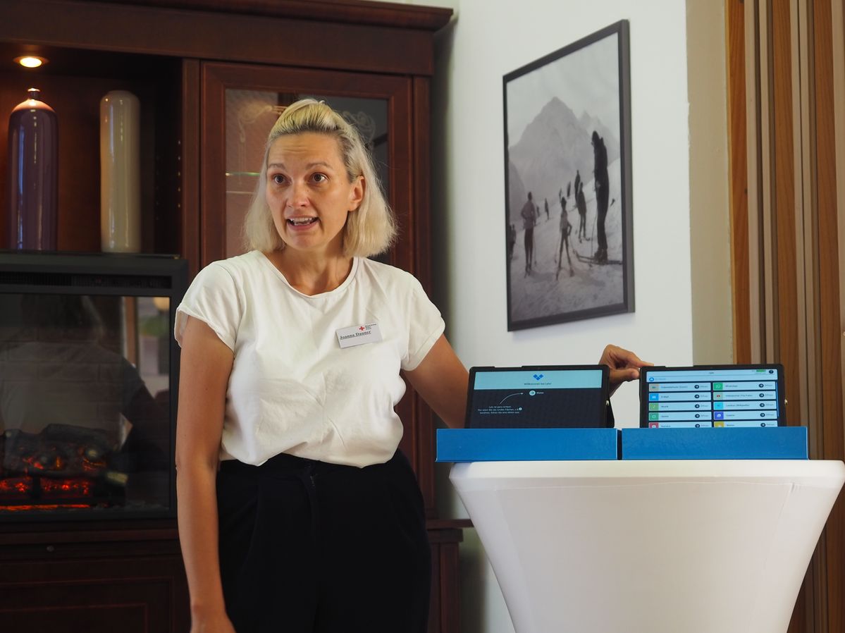 Der Projektname HILDE stehe für haptische Interfaces für lebendige digitale Erfahrungen, so Professorin Dauner und erklärte sogleich, was es mit diesen wissenschaftlichen Begriffen auf sich habe. „Wir möchten die Video-Telefonie und damit den Austausch mit Nahestehenden, die nicht persönlich vorbeischauen können, mittels einer idealen Technologie leichter anwendbar machen.“ Die Bedienoberfläche eines Tablets soll eigens für die speziellen Bedürfnisse von älteren Nutzern gestaltet werden. Hierzu möchte sie das Wissen der Seniorinnen und Senioren in der Rotkreuzeinrichtung nutzen. „Sie sind die Alltagsexperten, die das neu entwickelte Tablet ausprobieren sollen und uns Forschern ihre Erfahrungen und Anregungen zurückmelden“, sagte sie.