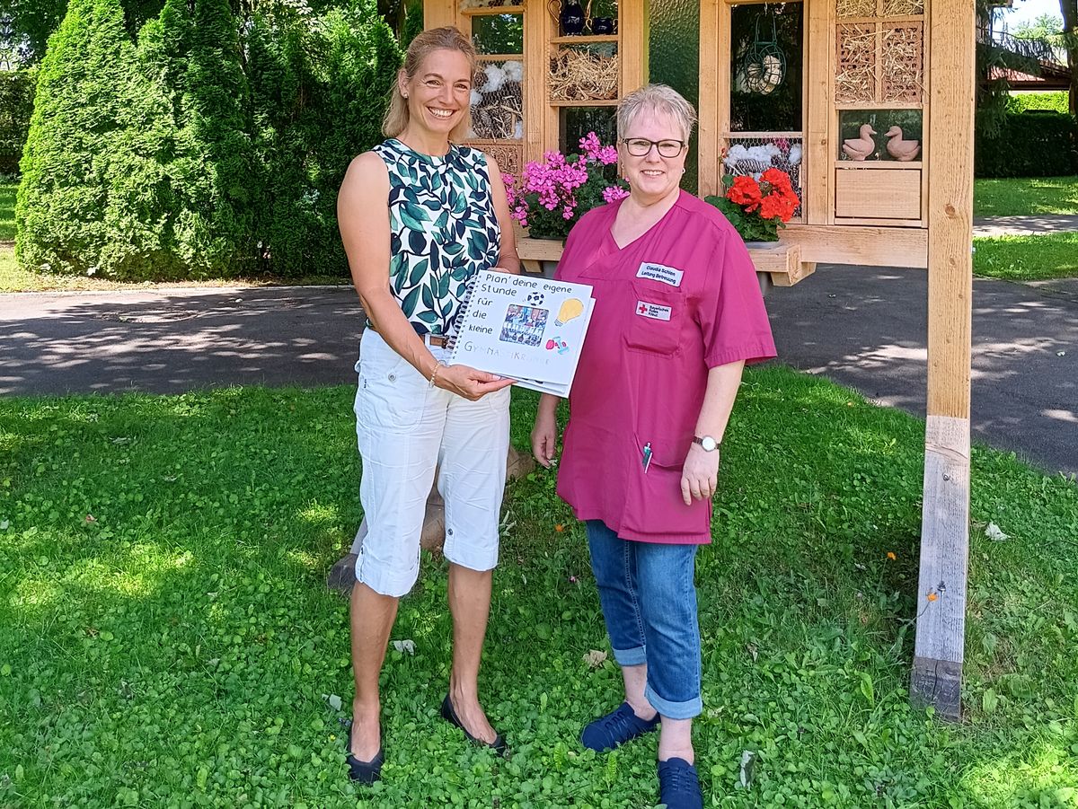 Im Rahmen ihres Projektseminars 'Aktiv sein - aktiv bleiben' erstellten sieben Schülerinnen des Gymnasiums Marktoberdorf nach mehrwöchigem Training und Bewegungsspielen mit einer Bewohnergruppe im Gulielminetti Seniorenwohn- und Pflegeheim ein Planungsbuch für Seniorengymnastikstunden als Abschlussarbeit. Dieses überreichte stellvertretend Gymnasiallehrerin Frau Stefanie Rüger an die Leitung der sozialen Betreuung Frau Claudia Schien.