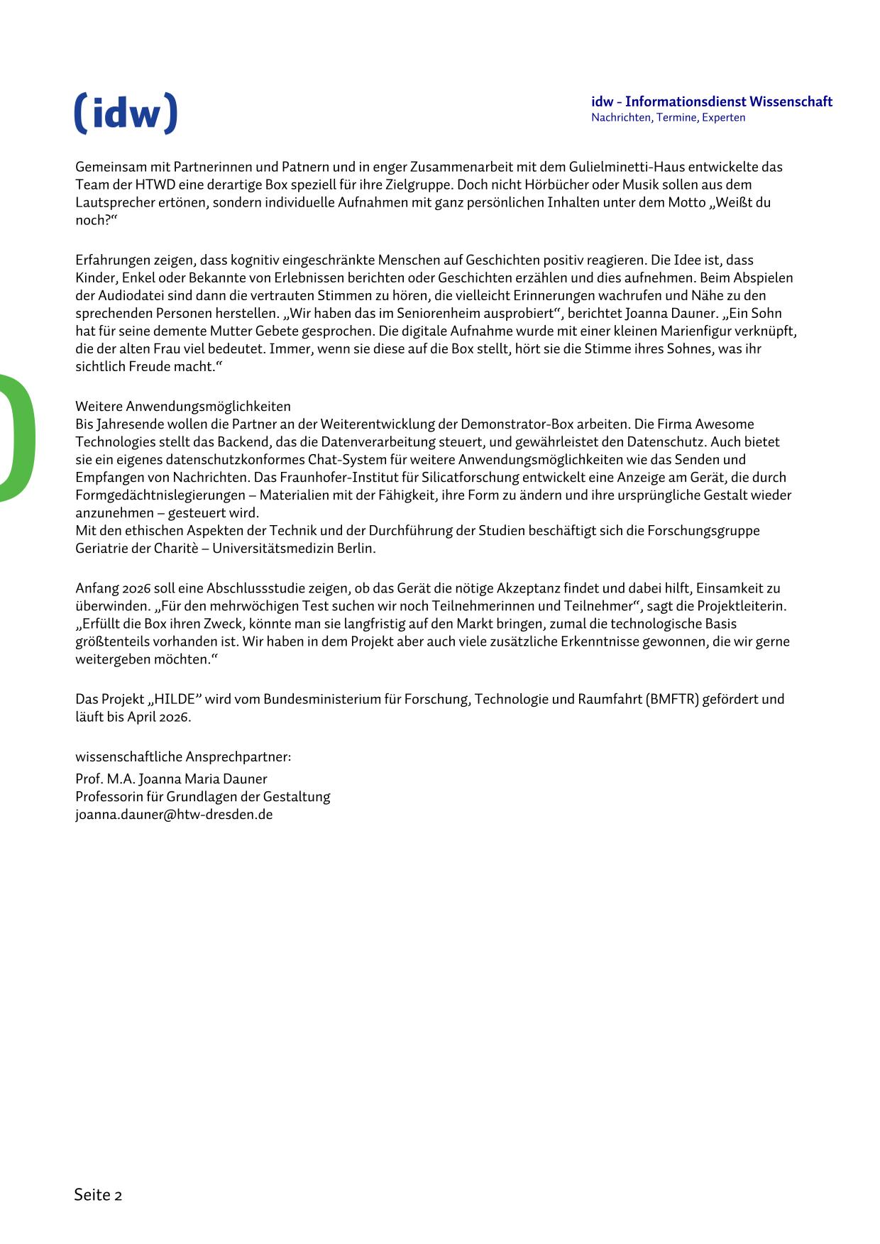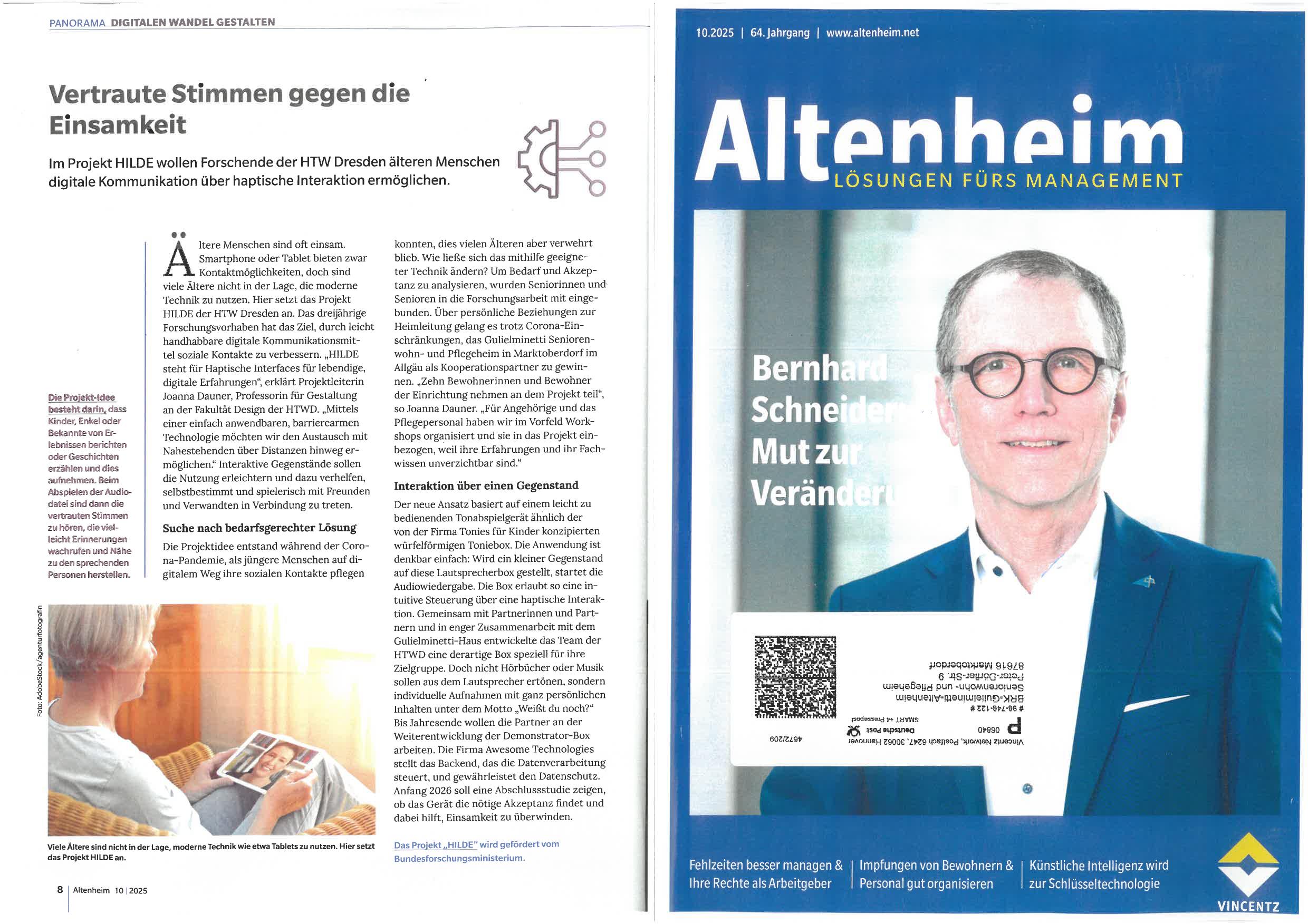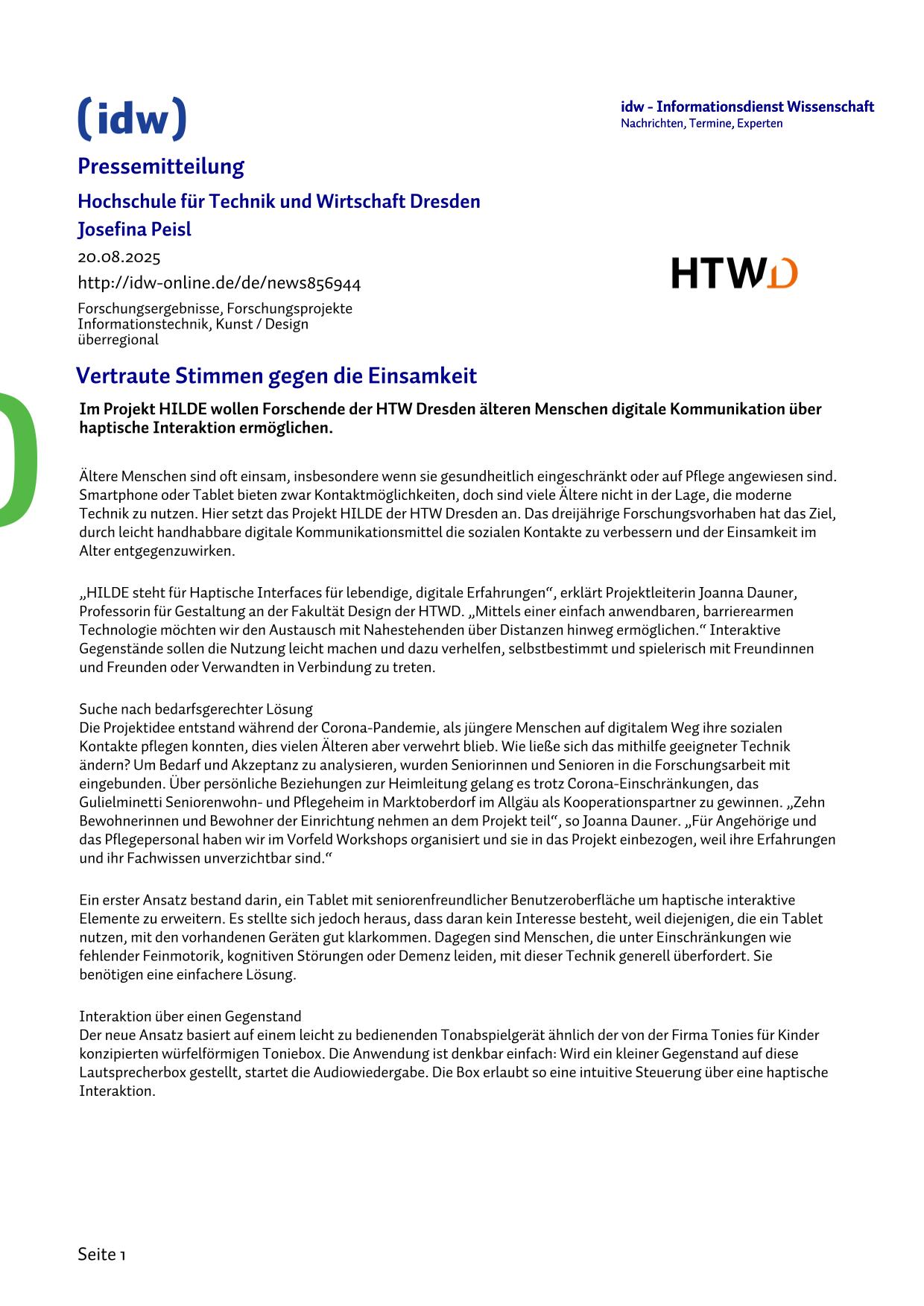 Parallel dazu geht das Forschungsprojekt „HILDE“ in die nächste Runde. Das Projekt der Hochschule für Technik und Wirtschaft Dresden hat das Ziel, ältere Menschen auch über räumliche Distanzen hinweg mit ihren Liebsten zu verbinden. Im Fokus steht die Entwicklung eines technischen Geräts, das auf einfache und spielerische Weise den Austausch von Nachrichten, Erinnerungen und Geschichten ermöglicht.