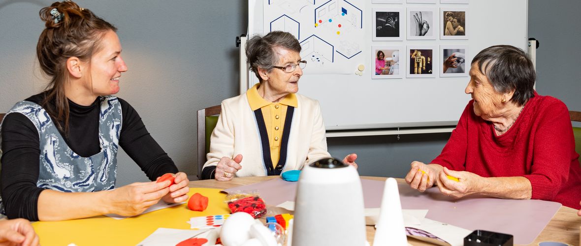 Soeben ist die nächste Projektphase angelaufen. Angehörige der Bewohner sind eingeladen, aktiv an der Entwicklung des Tablets mitzuwirken. Hierfür erhalten sie eine sogenannte „Mitmachkiste“, die Kreativmaterialien und ein Aufnahmegerät enthält. In ihrem eigenen Tempo können sie damit Gedanken festhalten sowie Geschichten und Erinnerungen gestalten, die in das Gerät integriert werden könnten. „Wir möchten die Perspektiven der Angehörigen kennenlernen, um auf die Bedürfnisse älterer Menschen noch besser eingehen zu können“, erklärt Professorin Joanna Dauner, Leiterin des Projektteams.