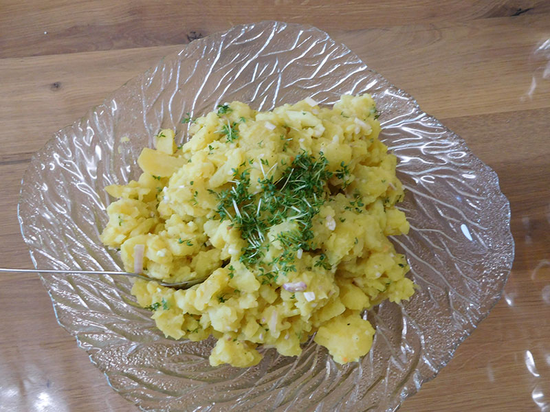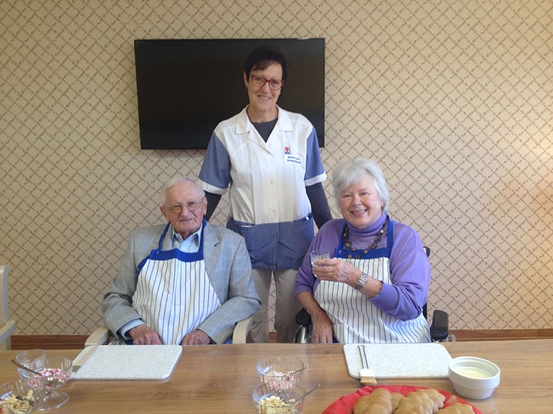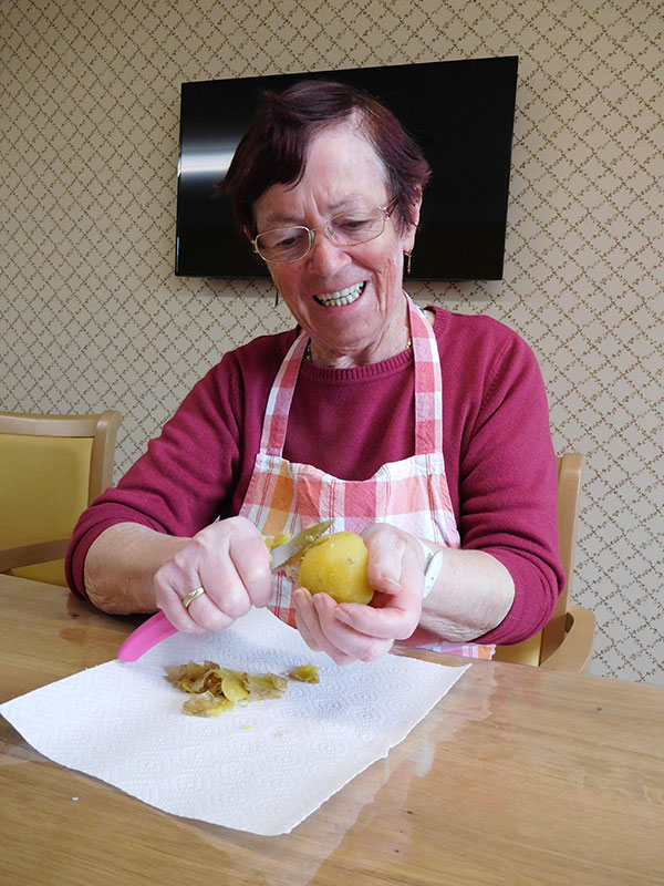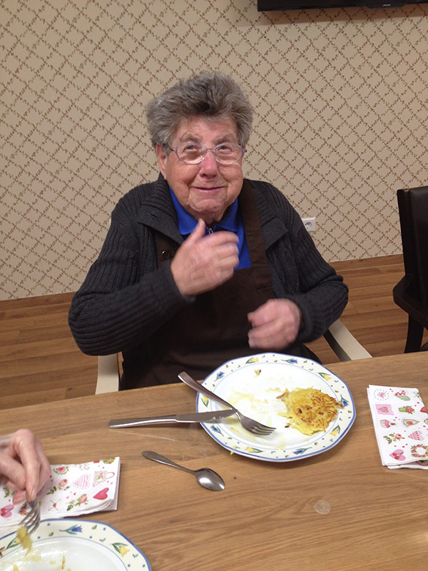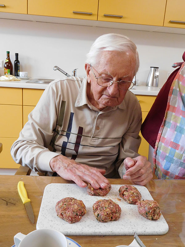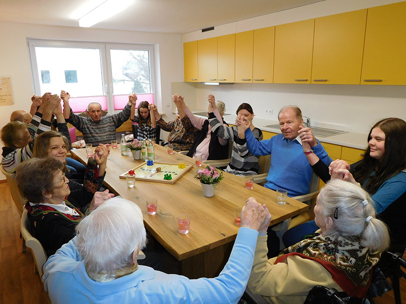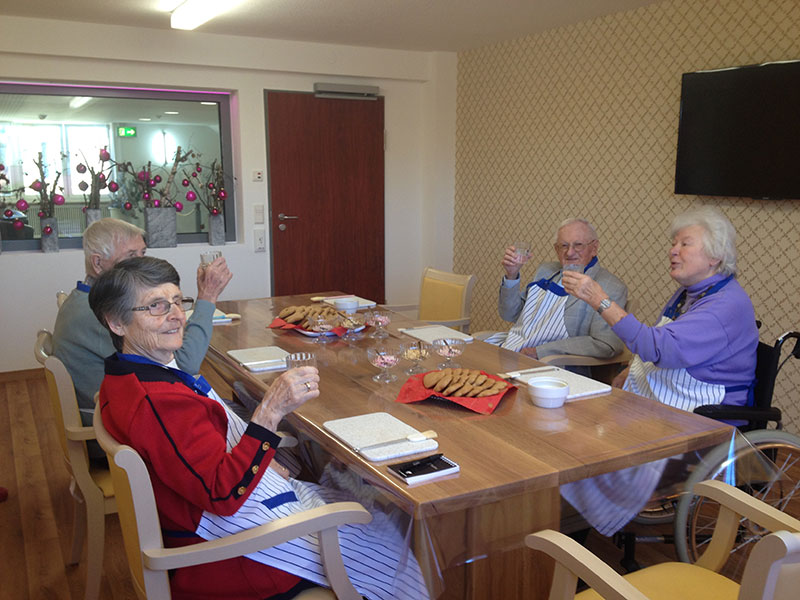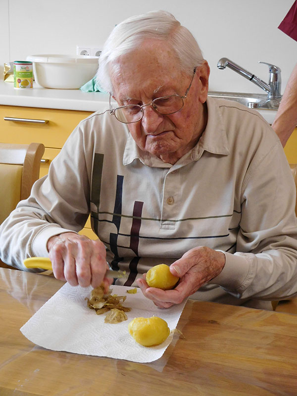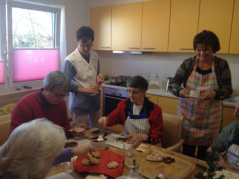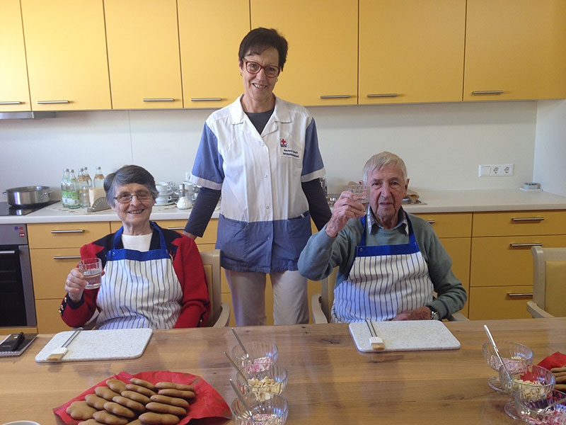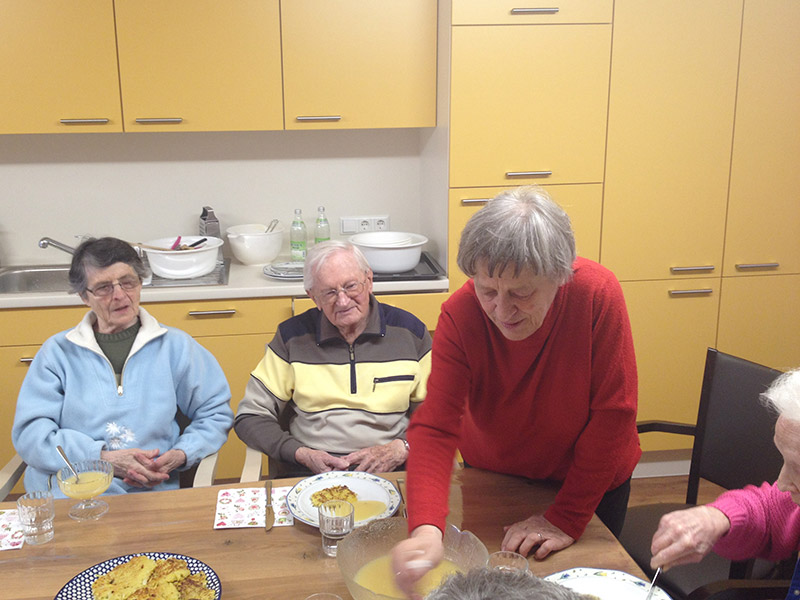 Die Therapieküche steht auch offen für spontane Aktionen, wie beispielsweise der Zubereitung jahreszeitlicher Speisen (Erdbeerkuchen, Obstsalat, Schnittlauchbrot, Schmalzbrot, …) und fördert so die Gemeinschaft, regt die Sinne an, weckt Erinnerungen und erhält die Feinmotorik der Bewohnerinnen und Bewohner.