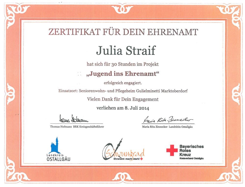 Am Dienstag, den 08. Juli 2014 fand im Rahmen einer Feier eine Zertifikatsverleihung für das Projekt „Jugend ins Ehrenamt" statt.