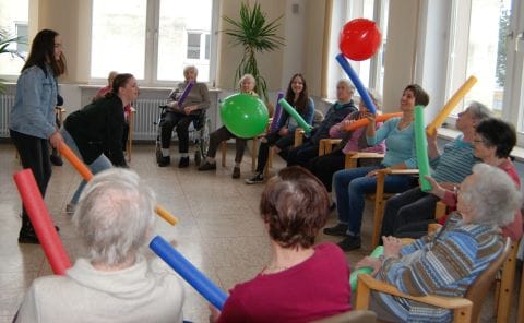 Einmal wöchentlich versammelten sich zahlreiche Senioren und die Ergotherapeuten Anna Berktold und Michael Eberle im Aufenthaltsraum des Gulielminetti und empfingen ein Schülerinnenteam. Bepackt mit bunten Luftballons und Funnoodles begrüßten Melanie und Carla an einem Freitagvormittag die Bewohner. Dann ging es los. „Hände einmal ausschütteln und mit dem Daumen nacheinander Zeige-, Mittel-, Ring- und kleinen Finger antippen.“ Jeweils ein Schülerinnenduo war verantwortlich für die Gestaltung einer Gymnastikstunde. Sie überlegten sich im Vorfeld mobilisierende und koordinative Übungen und leiteten dann die Seniorengruppe selbstständig an. Ergotherapeutin Berktold stand ihnen dabei immer hilfreich zur Seite.