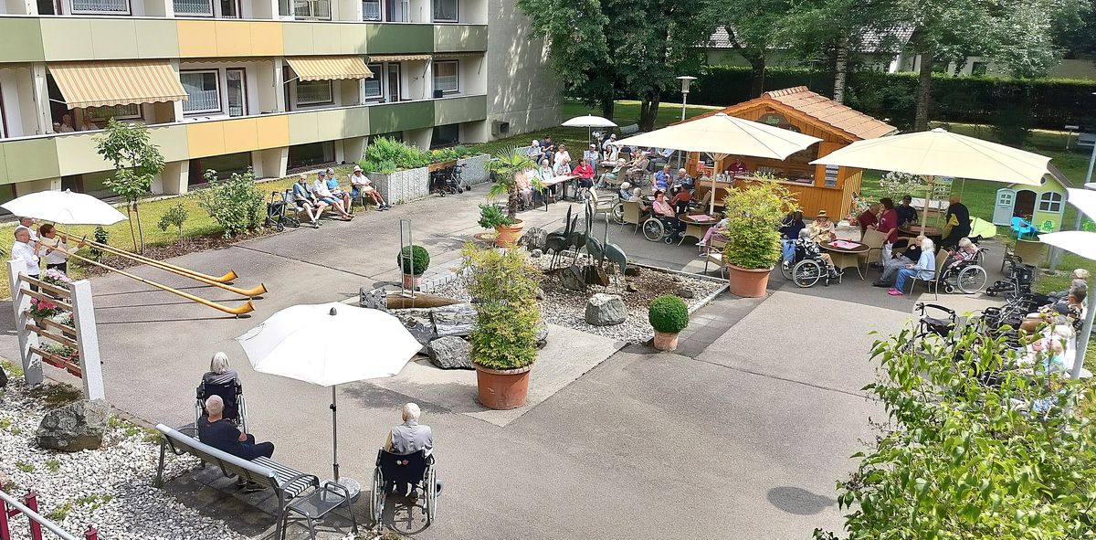 Trotz wechselhaften Wetters herrschte im Garten des BRK Gulielminetti Seniorenwohn- und Pflegeheims in Marktoberdorf von Anfang an eine fröhliche und erwartungsvolle Stimmung. Für besondere musikalische Momente sorgte die Alphornbläsergruppe „Alpträume“, die mit ihren traditionellen Klängen Bewohnerinnen, Bewohner sowie deren Angehörige begeisterte.