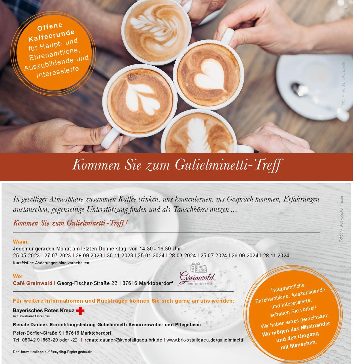 Viele verschiedene Menschen arbeiten und engagieren sich täglich im Gulielminetti-Haus in Marktoberdorf. Ob Hauptamtliche, Auszubildende oder Ehrenamtliche, Einrichtungsleitung Renate Dauner ist der Austausch mit allen und auch jenen, die sich ein zukünftiges Engagement im Seniorenbereich vorstellen können, wichtig. „Ich bin froh, dass wir unsere offene Kaffeerunde in lockerer Atmosphäre nach drei Jahren Corona-bedingter Pause endlich wieder aufnehmen können.“ Start des Gulielminetti-Treffs ist am letzten Donnerstag im Mai im Café Greinwald.