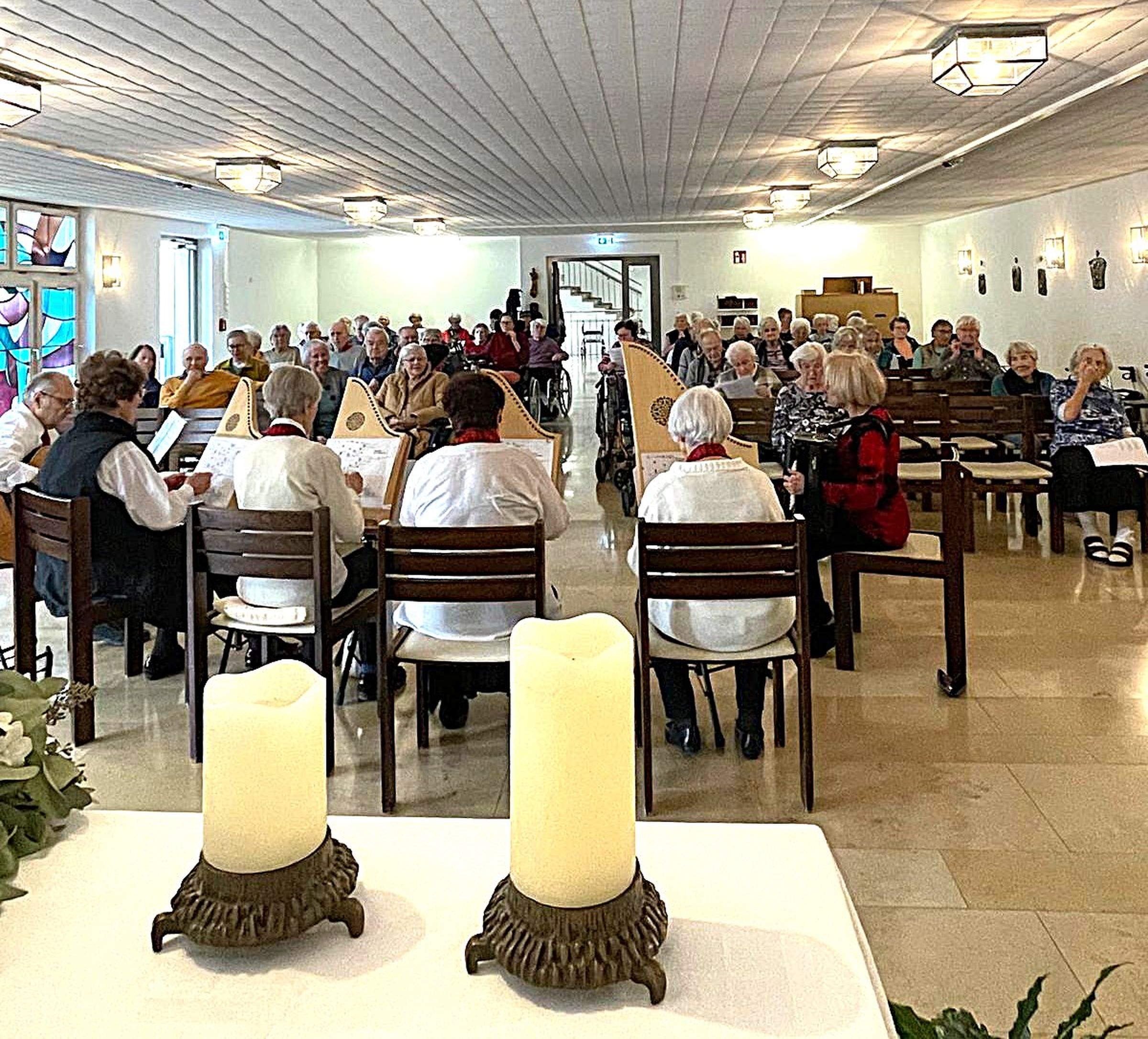 Unter der Leitung von Angelika Jekic präsentierte das Ensemble ein abwechslungsreiches Programm mit bekannten Evergreens, Klassikstücken, Volksliedern und Walzern. Die sanften Klänge der Tischharfen erfüllten die Hauskapelle und sorgten für eine heitere Atmosphäre. Besonders die vertrauten Lieder luden zum Mitsingen ein. „Die Begeisterung und Freude unserer Bewohner war deutlich zu spüren. Musik verbindet und schafft schöne gemeinsame Momente“, so Einrichtungsleitung Renate Dauner.