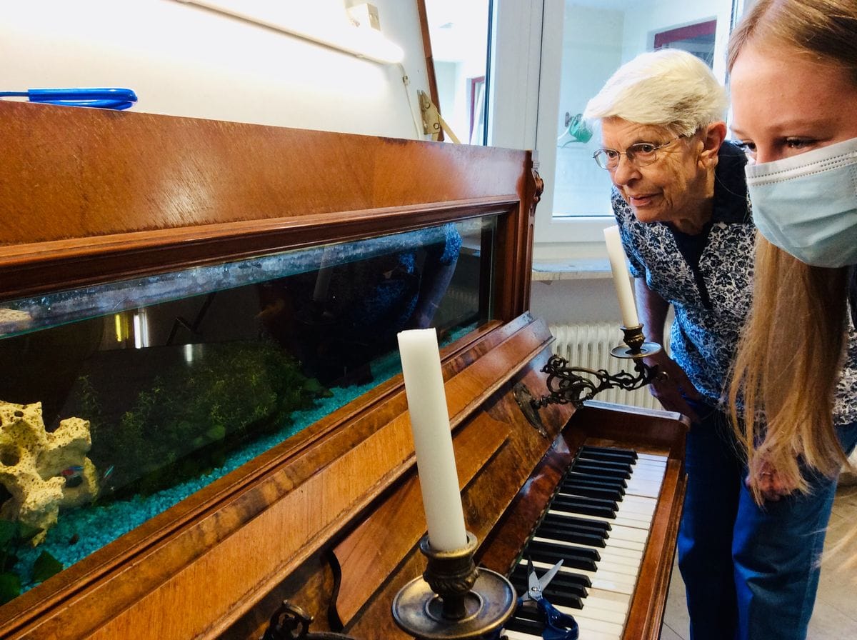 Fischkonzert im Klavier - Schülerin und Bewohnerin pflegen Aquarium