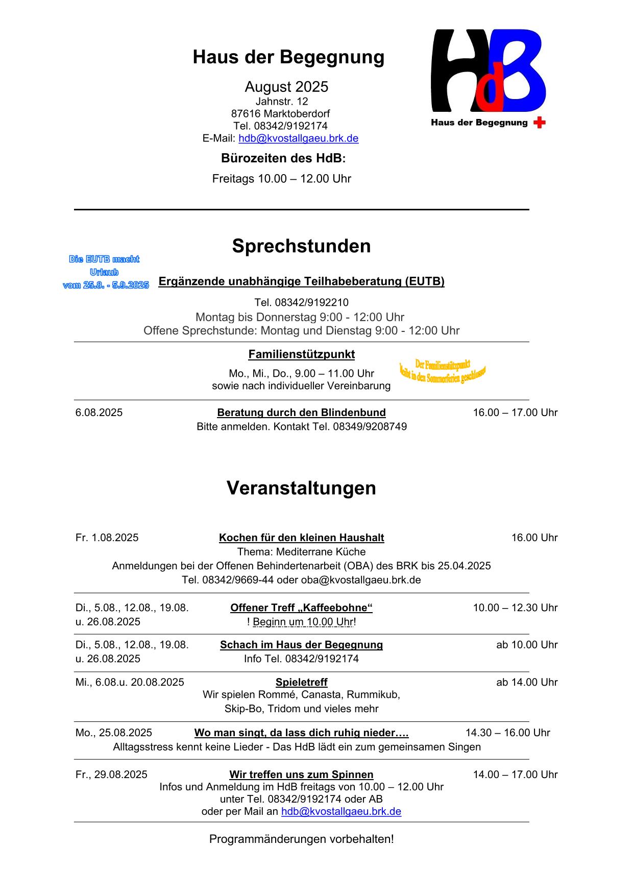 Haus der Begegnung - Programm für August