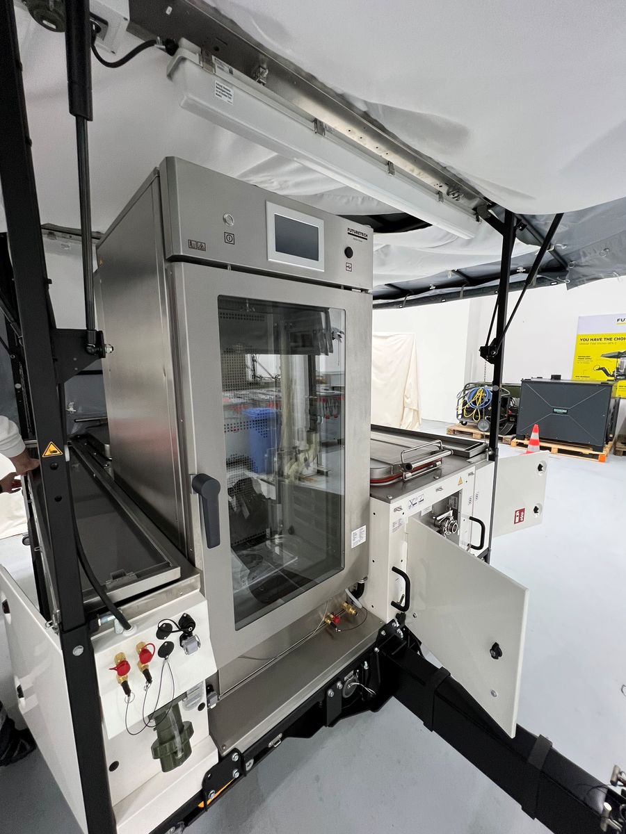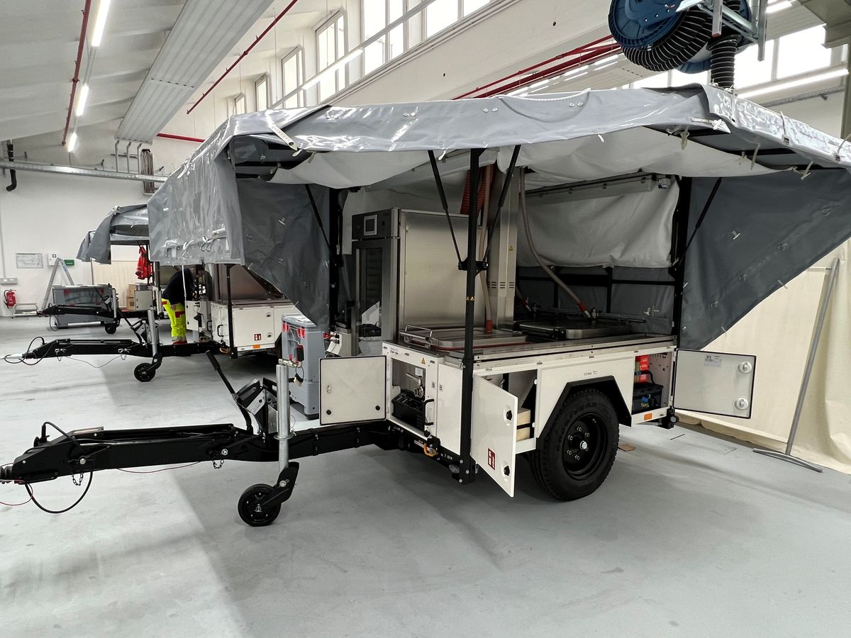 Je nach Anforderung können komplette Menüs für bis zu 250 oder einfache Gerichte für 600 Personen zubereitet werden. Die Ausstattung umfasst einen Kombidämpfer mit 15 Einschubebenen, zwei Kessel à 133 Liter sowie ein Bratmodul mit 68 Litern Fassungsvermögen. „Die Module können direkt auf der Feldküche montiert oder bei Bedarf auch separat betrieben oder mit anderen Feldküchen gekoppelt werden – ein wichtiger Vorteil bei unterschiedlichen Einsatzszenarien von kleinen Versorgungspunkten bis hin zur Massenverpflegung,“ so Michael Stemmler.
