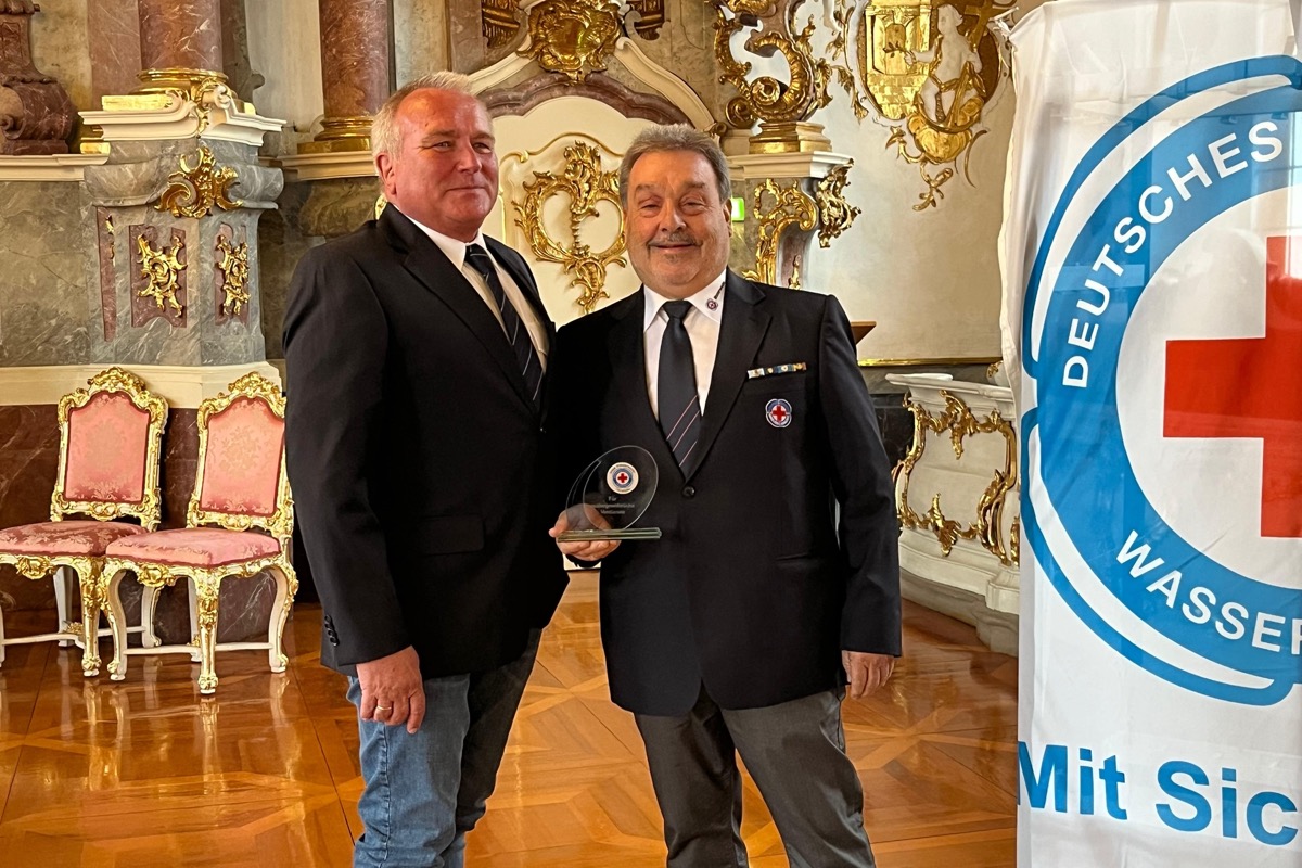 Ein bedeutender Moment für Rudi Achatz, erster Vorsitzender der Wasserwacht Füssen. Denn er ist der Erste, der die Ehrung der Kreiswasserwacht Ostallgäu für außergewöhnlichen Verdienste innerhalb der Ostallgäuer Wasserwachten verliehen bekam. Anlässlich eines Ehrungsempfanges des Bezirks Schwaben im Goldenen Saal in Dillingen überreichte Andreas Gmeindner, Vorsitzender der Kreiswasserwacht Ostallgäu, die eigens für diese Auszeichnung entworfene Medaille.