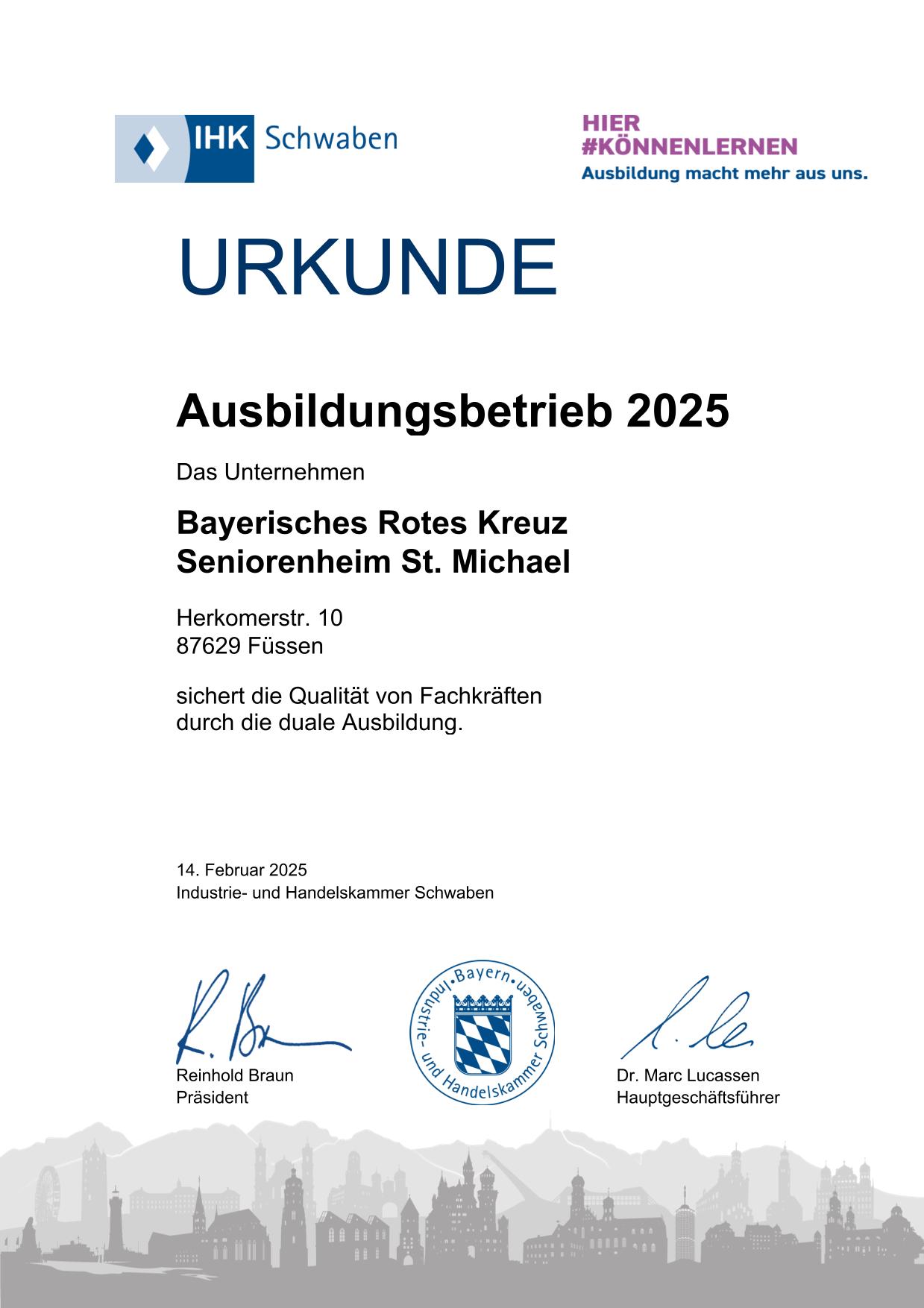 Auch für das Jahr 2025 zeichnete die IHK Schwaben das Seniorenheim St. Michael in Füssen als qualifizierten Ausbildungsbetrieb aus.