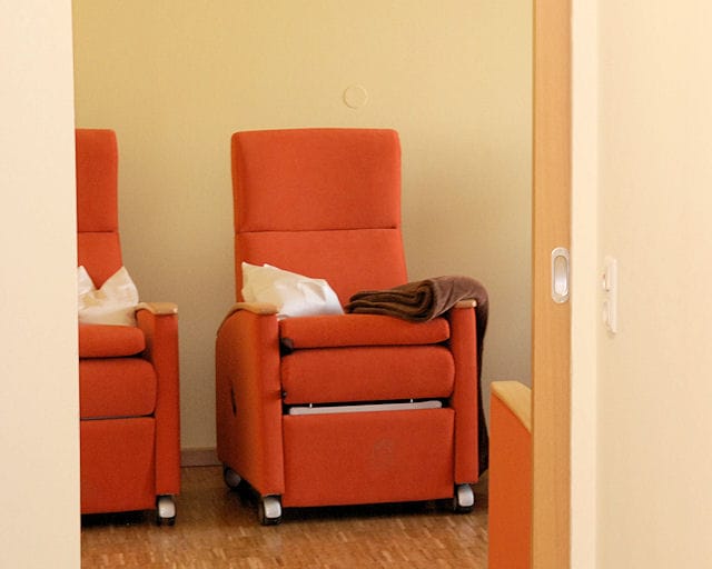 - Moderne Ruhesessel für jeden Tagesgast, zentrale Küche für gemeinsames Kochen und Backen