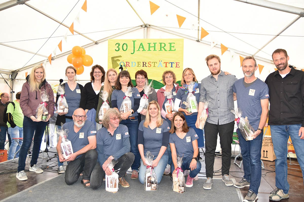 Nach einem gelungenen Festakt bedankte sich Förderstättenleiter Thomas Pahl (rechts) bei seinem Mitarbeiterteam für die gute Unterstützung und dass sie alle mit so viel Herzblut bei der täglichen Arbeit dabei sind.