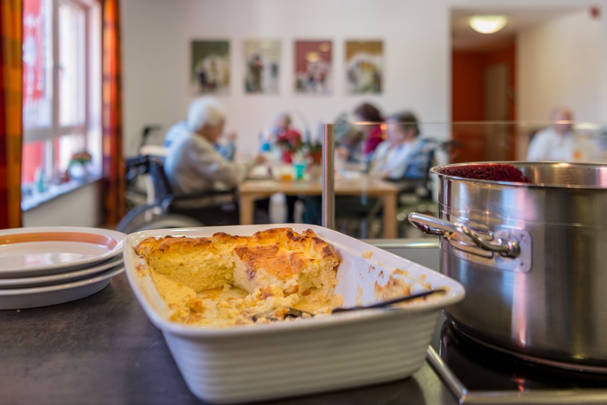 So wird in jeder Hausgemeinschaft eine hauswirtschaftliche Versorgung den ganzen Tag über vom Frühstück, Mittagessen, Kaffee und Abendessen angeboten. Wir achten darauf, dass jede Mahlzeit mit frischen Produkten aus der Region gekocht wird. Die Bewohner können sich jederzeit an der Zubereitung der Speisen oder der Vorbereitung der Tische beteiligen, wenn sie wollen. Der Duft des Kochens weckt Erinnerungen und macht Appetit. Kaffee und Kuchen - jeden Tag frisch gebacken - oder die Geburtstagstorte gehören selbstverständlich zum Alltag. Für das Ernährungsmanagement ist in jeder Hausgemeinschaft die Präsenzkfraft, stets eine ausgebildete Hauswirtschafterin, zuständig.