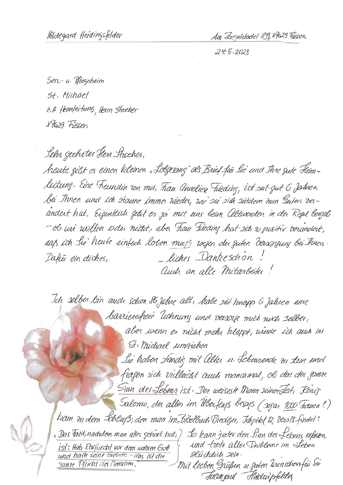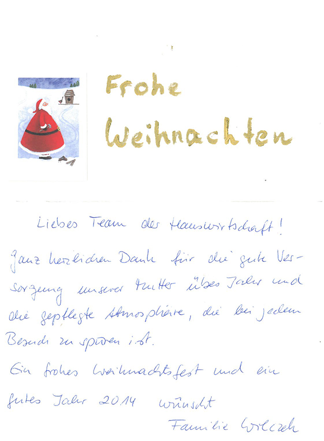 "Nach fast neun Jahren in Ihrem Haus ist meine Mutter vor zwei Wochen gestorben. Auch wenn ich es persönlich schon getan habe, so ist es mir immer noch ein Bedürfnis, mich bei Ihnen und den Mitarbeitern, die meine Mutter in all den Jahren betreut haben, herzlich zu bedanken. Durch meine häufigen Besuche habe ich nicht nur die guten äußeren Bedingungen in Ihrem Haus, sondern auch die innere Atmosphäre kenne gelernt. Es hat mich nie Überwindung gekostet, das Haus zu betreten (wie ich es früher andernorts schon einmal erlebt habe), ich habe mich dort auch immer wohl gefühlt und die Arbeit der Pflegerinnen und Pfleger kenne und schätzen gelernt."