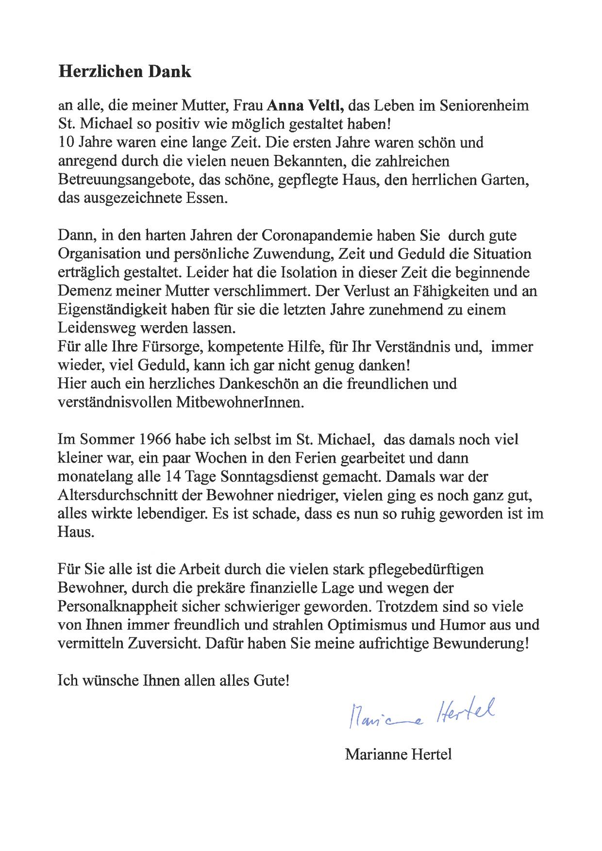 "Kurz vor den Feiertagen und dem Jahreswechsel ist es mir eine Bedürfnis, mich bei Ihnen und Ihrem vorzüglichen Team vom St. Michael zu bedanken für, die aufopferungsvolle Pflege, die stets spürbare Sorge um das Wohlergehen, die freundliche und zuverlässige Betreuung der Heimbewohner im Allgemeinen und meiner Mutter im Besonderen. Ich bin froh und dankbar, meine Mutter bestens aufgehoben zu wissen. Bei meinen Besuchen bin ich immer sehr nett und herzlich aufgenommen worden und fühle mich - wie meine Mutter - in Ihrem Haus sehr wohl."