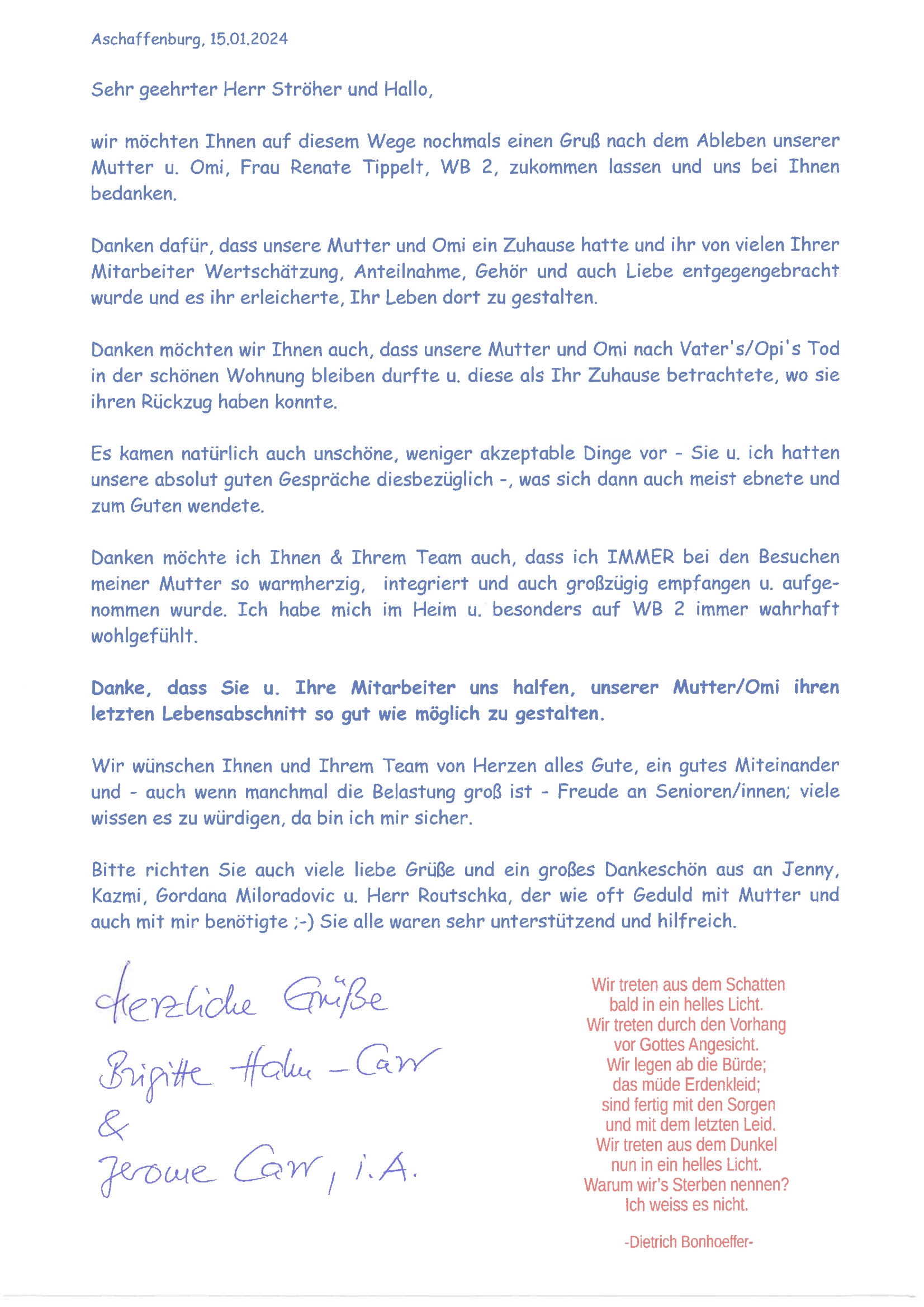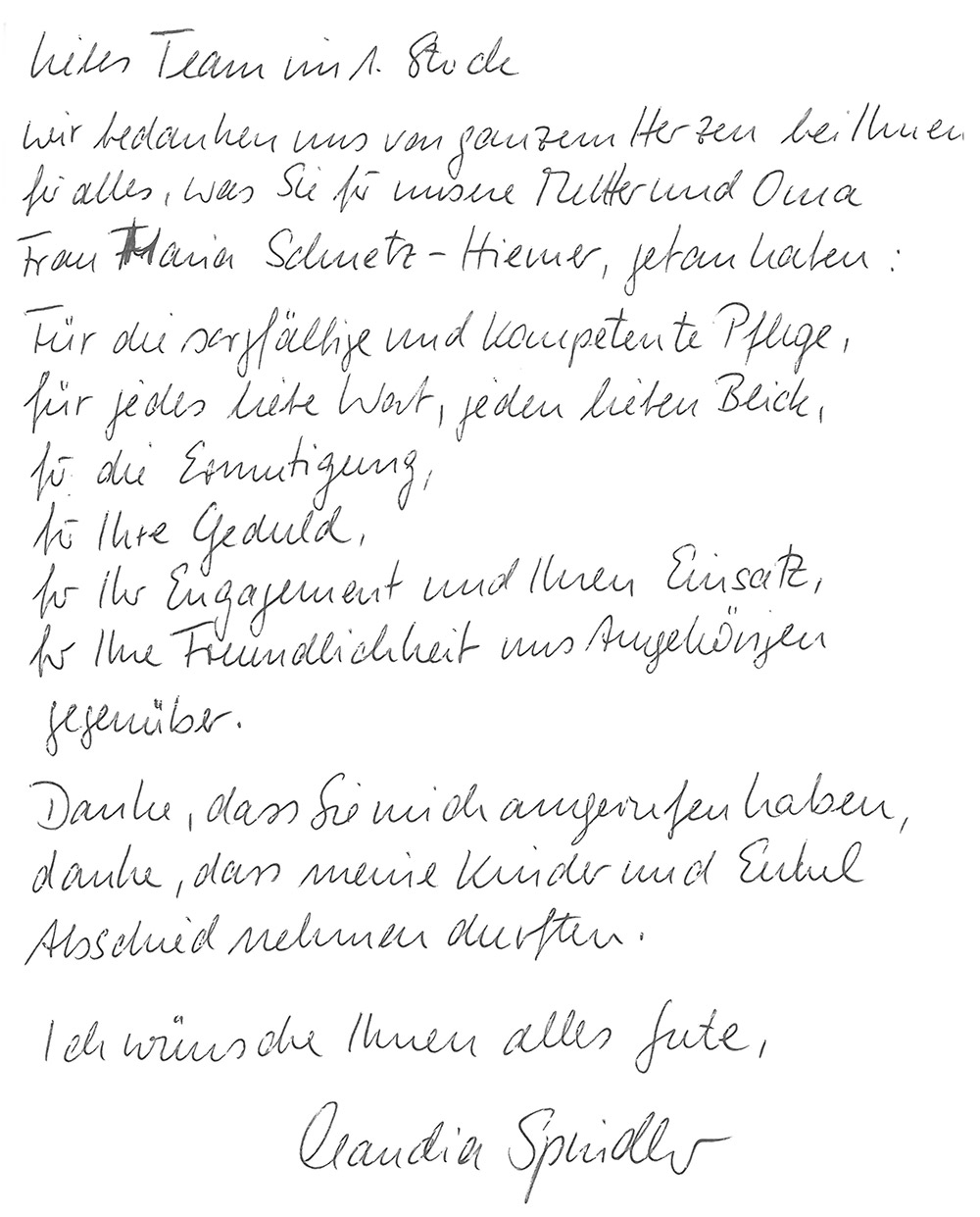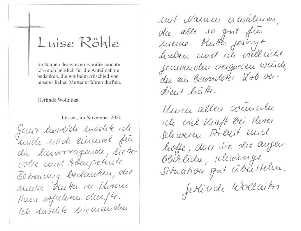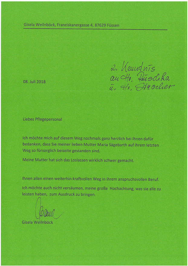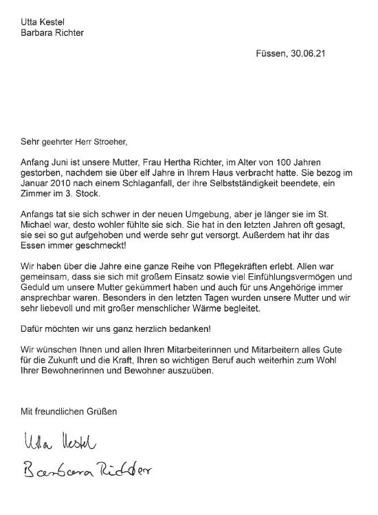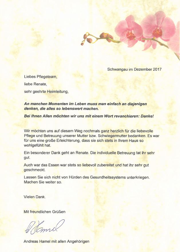 "Darüber hinaus danke ich noch mal allen Beteiligten in Ihrem Hause für die stets liebevolle persönliche Pflege und Betreuung meiner Mutter, die dort auf den Tag genau fünf Jahre bestens aufgehoben war."