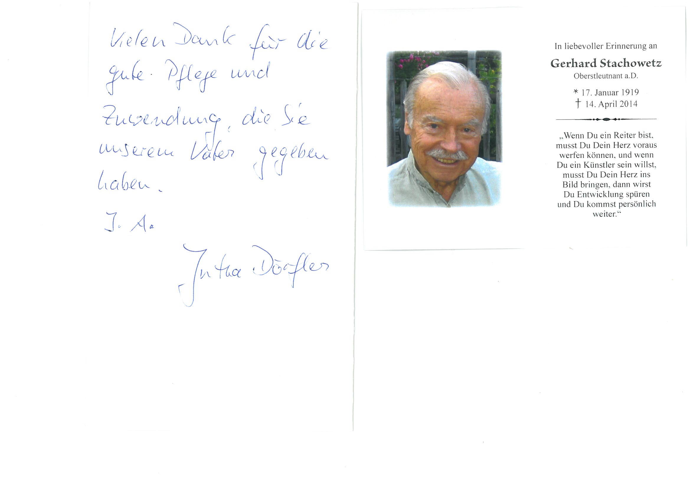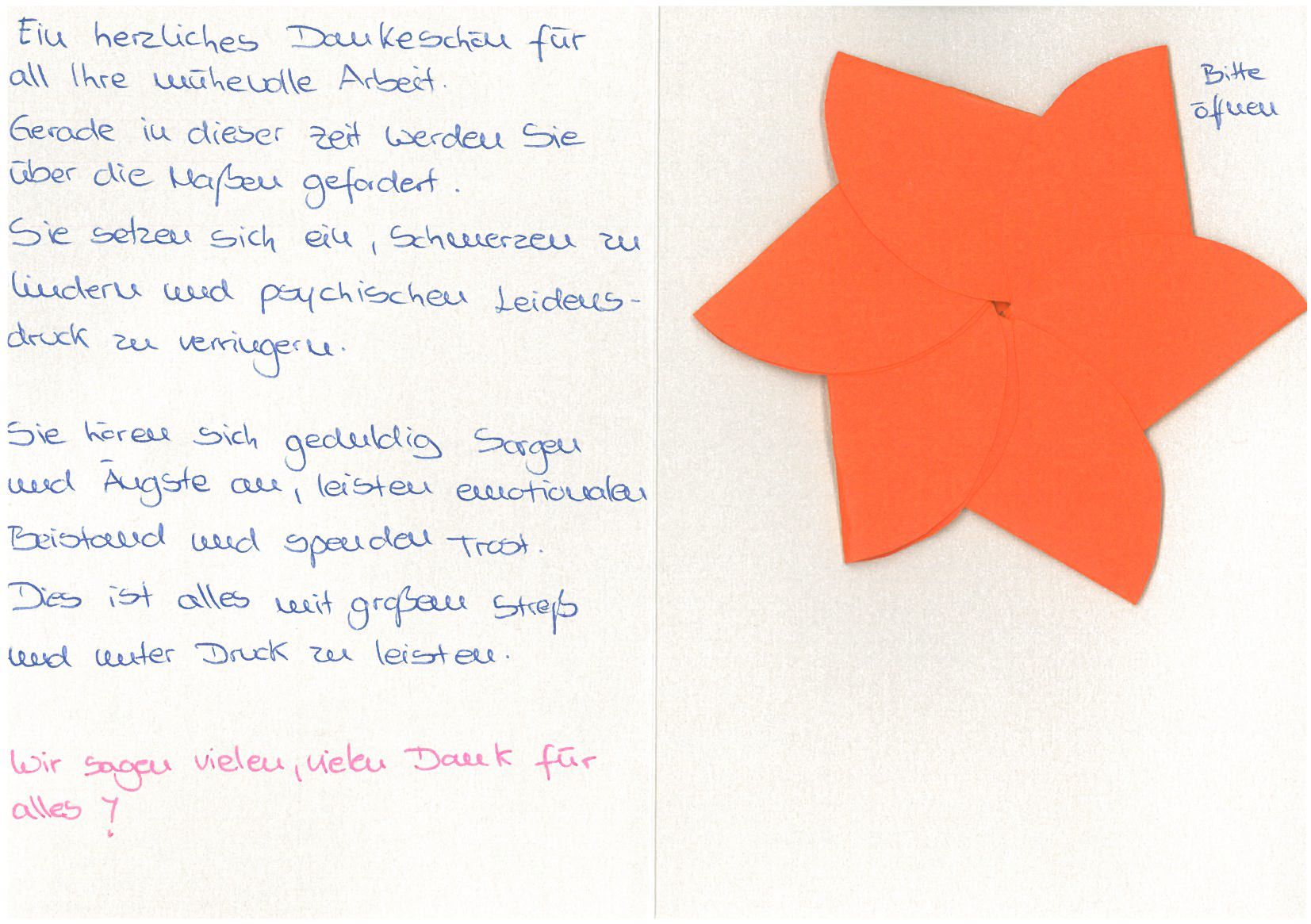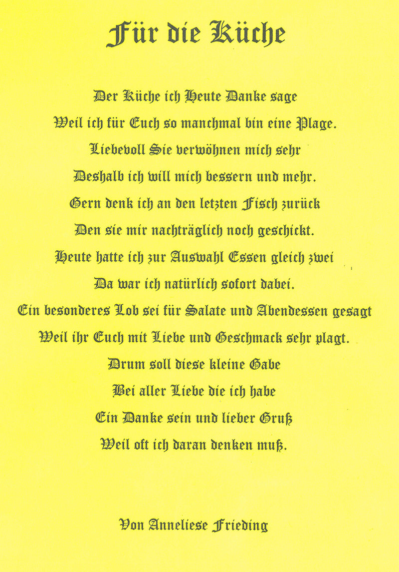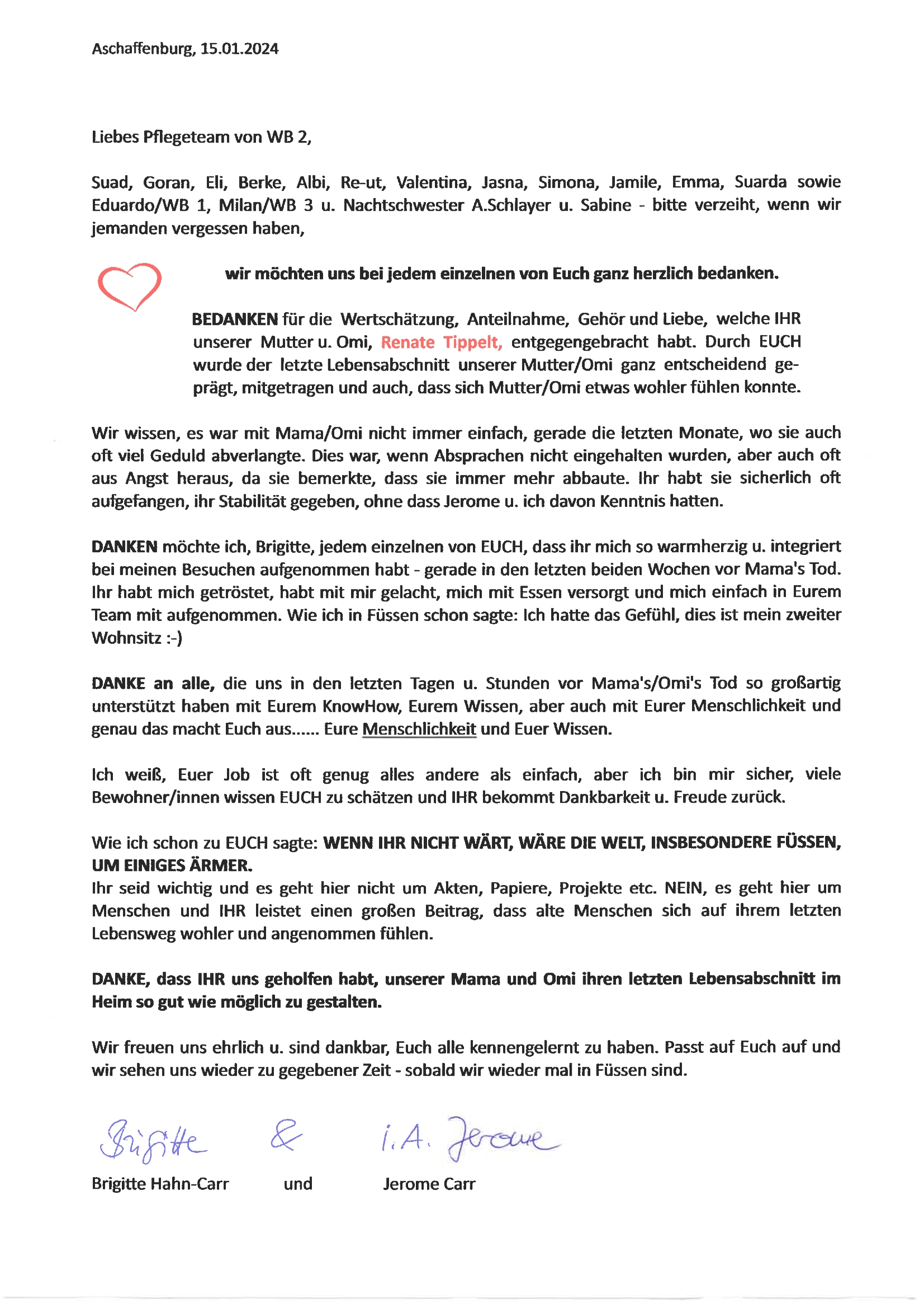 "Darüber hinaus danke ich noch mal allen Beteiligten in Ihrem Hause für die stets liebevolle persönliche Pflege und Betreuung meiner Mutter, die dort auf den Tag genau fünf Jahre bestens aufgehoben war."