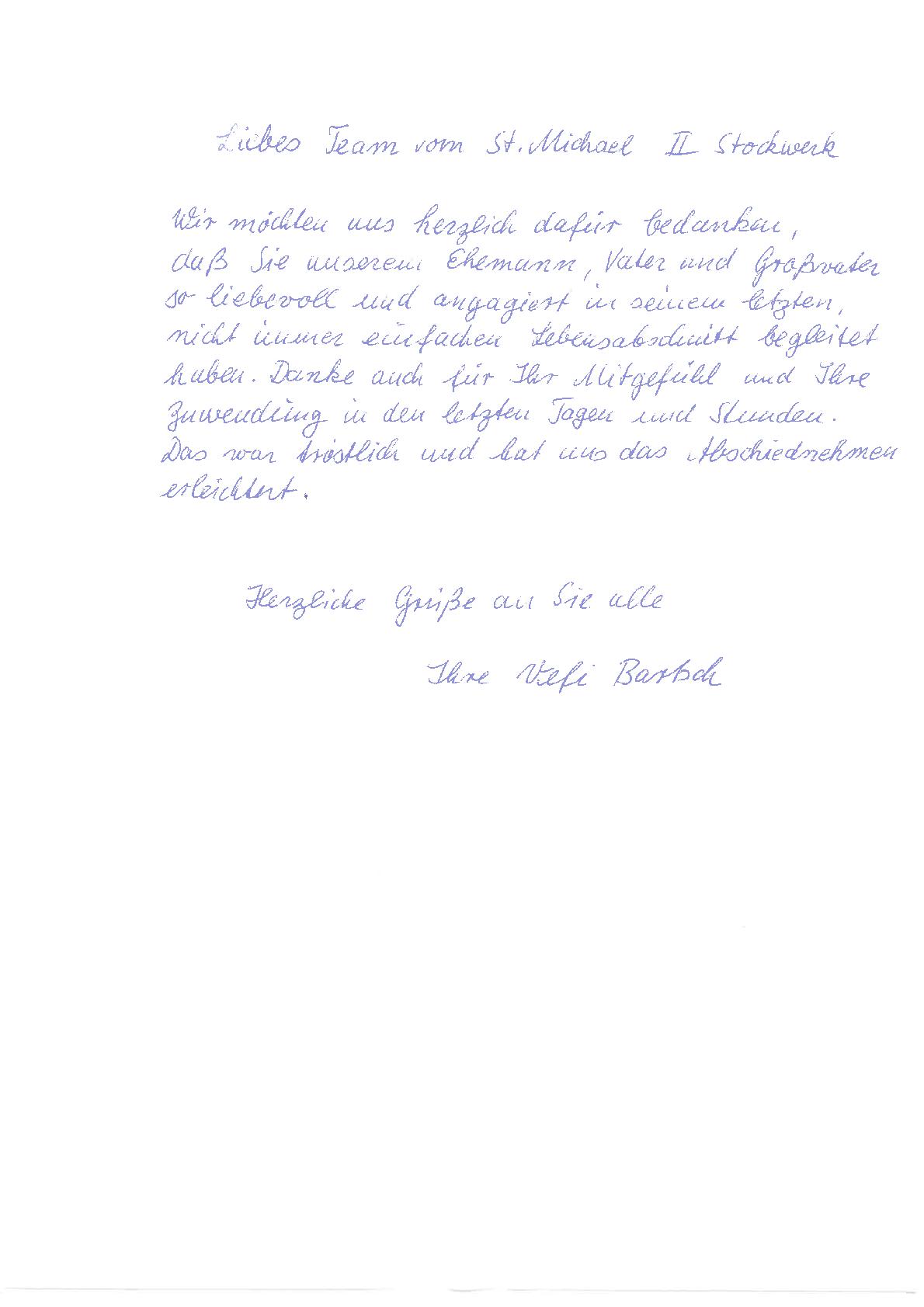 "Nochmals vielen herzlichen Dank an das gesamte Team im St. Michael. Meine Mama war bei Ihnen immer in guten Händen und fand eine zweite Heimat!"