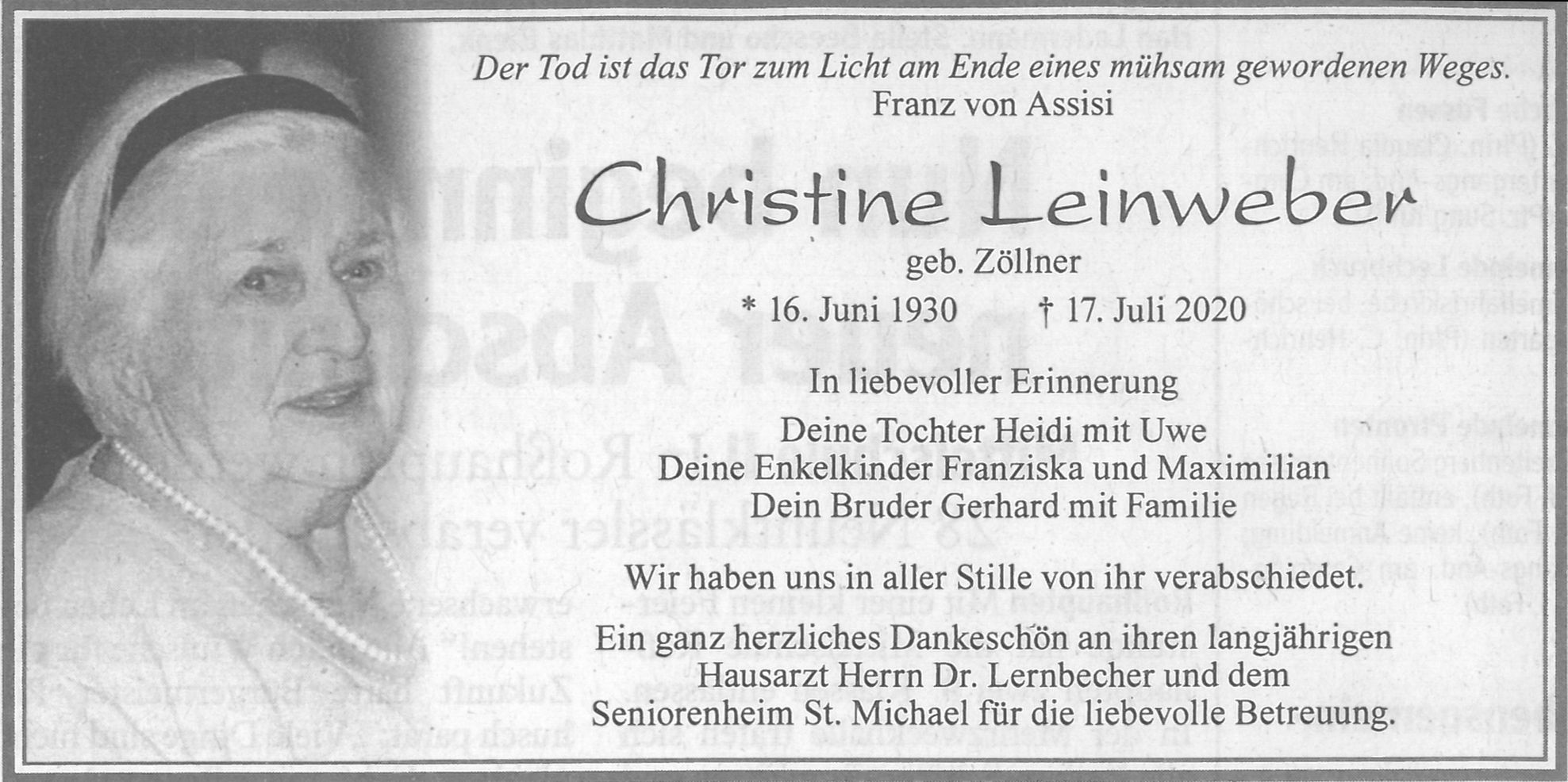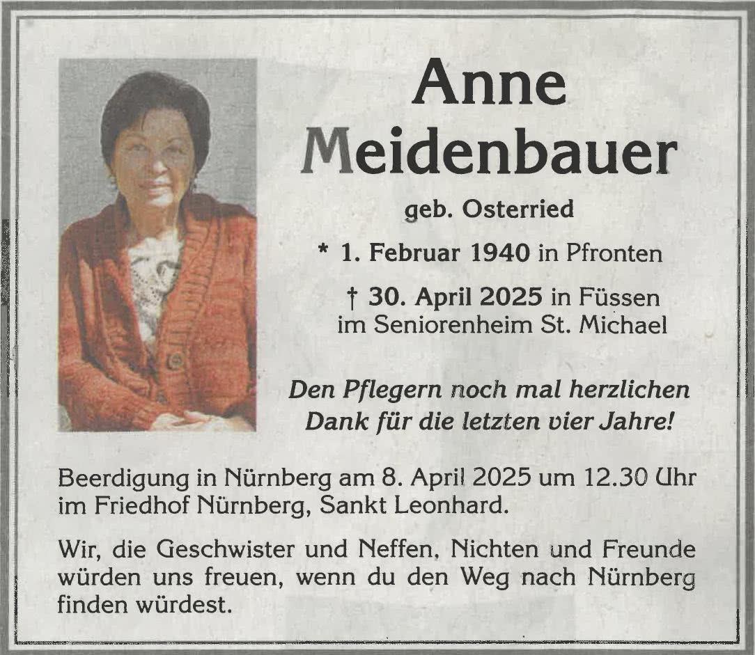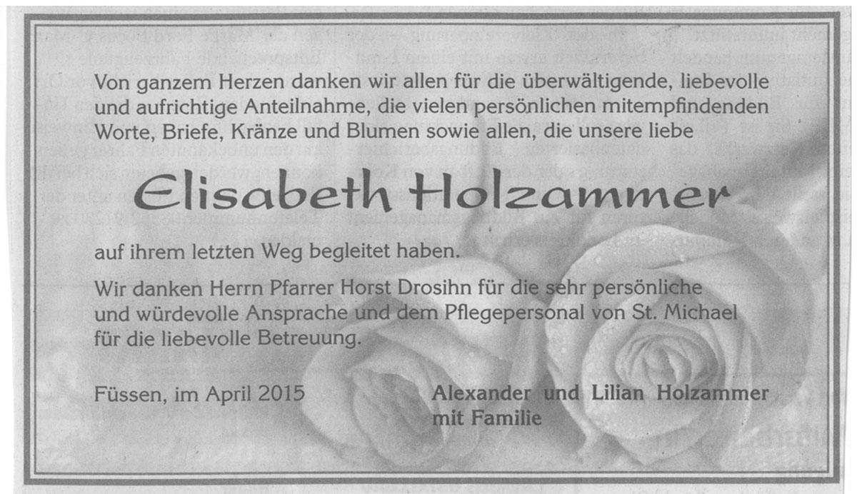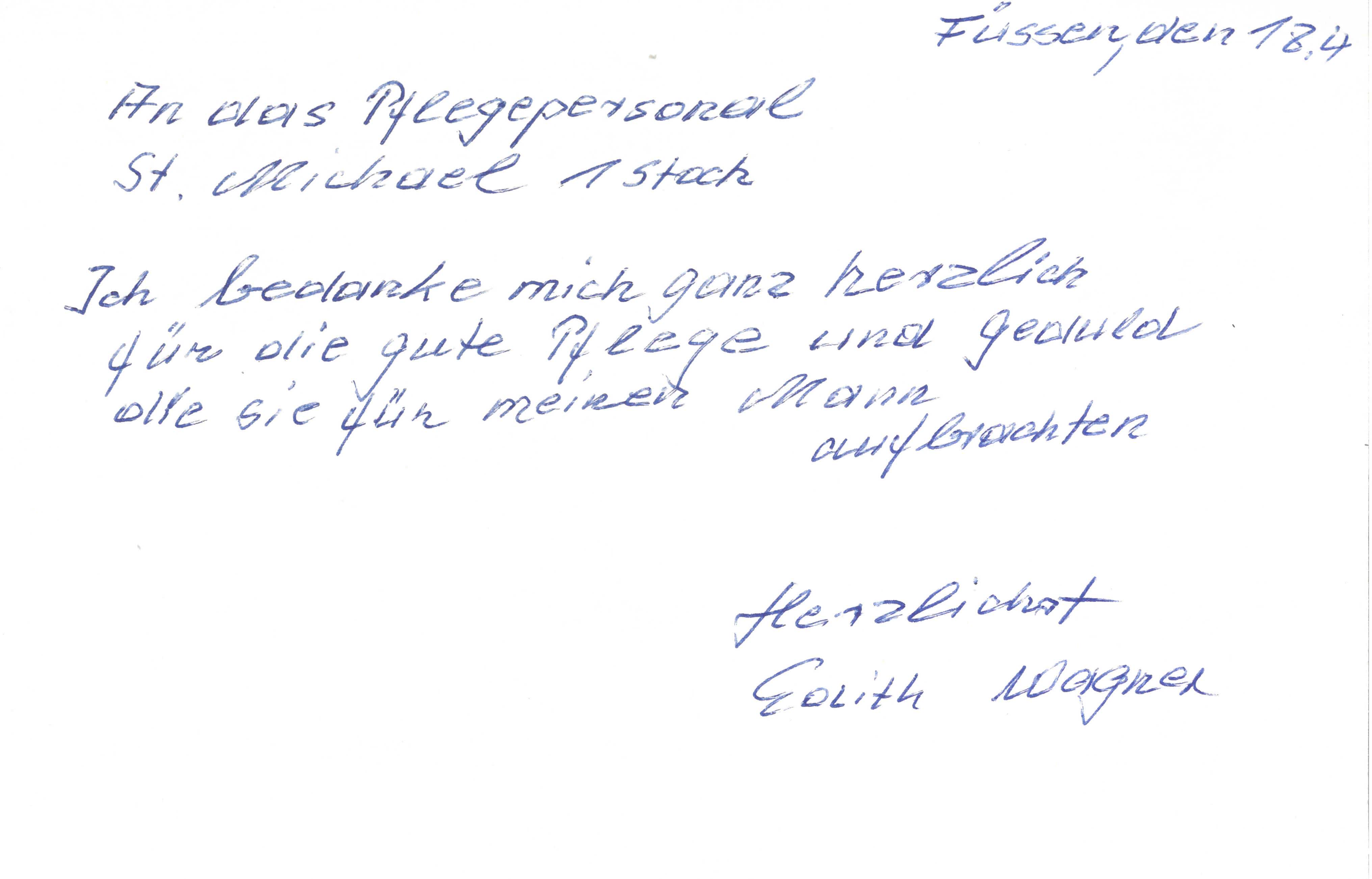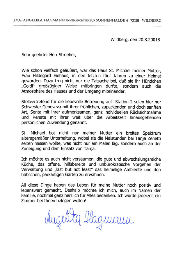 "Auf diesem Wege möchte ich mich ganz herzlich für den Transfer vom Krankenhaus Füssen in Ihr Haus bedanken. Ebenfalls für die liebevolle Aufnahme und Betreuung in den ersten Tagen ein herzliches Dankeschön. Da ich im Augsburger Raum lebe und arbeite, ist die Situation, nachdem ich meinen Vater bei Ihnen besten Händen weiß, um einiges entspannter, als vor einigen Wochen. Der Weg für meine Mutter von der Hohenstaufenstrasse ins St. Michael ist sehr kurz und somit ein großes Glück."