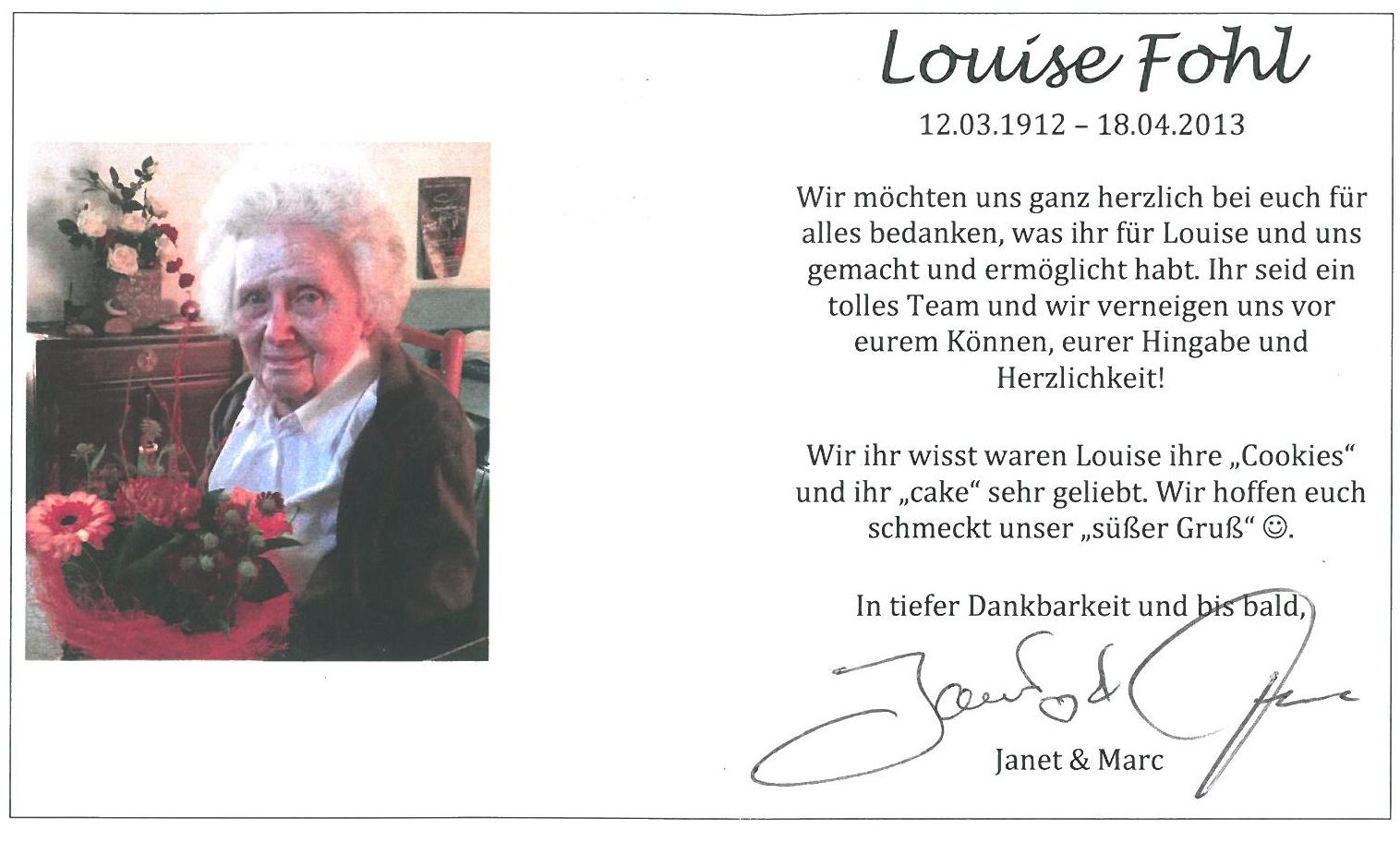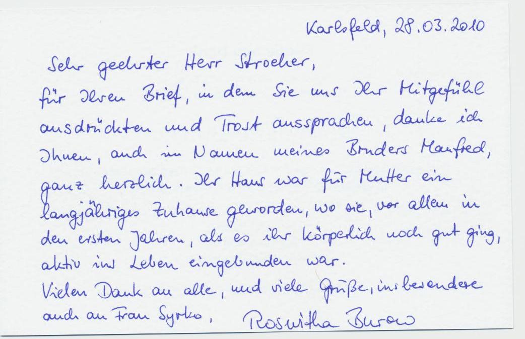 Ich möchte mich nochmals für die gute Betreuung und Pflege meiner Mutter, durch Ihre Mitarbeiterinnen und Mitarbeiter, bedanken. Sicherlich war dies nicht immer einfach. Besonderen Dank gilt auch Frau Syrko die immer ein offenes Ohr für meine Fragen oder Bitten hatte. Alles wurde immer von Ihr prompt bearbeitet. Und auch Ihnen ein herzliches Dankeschön. Mit kollegialen Gruß.
