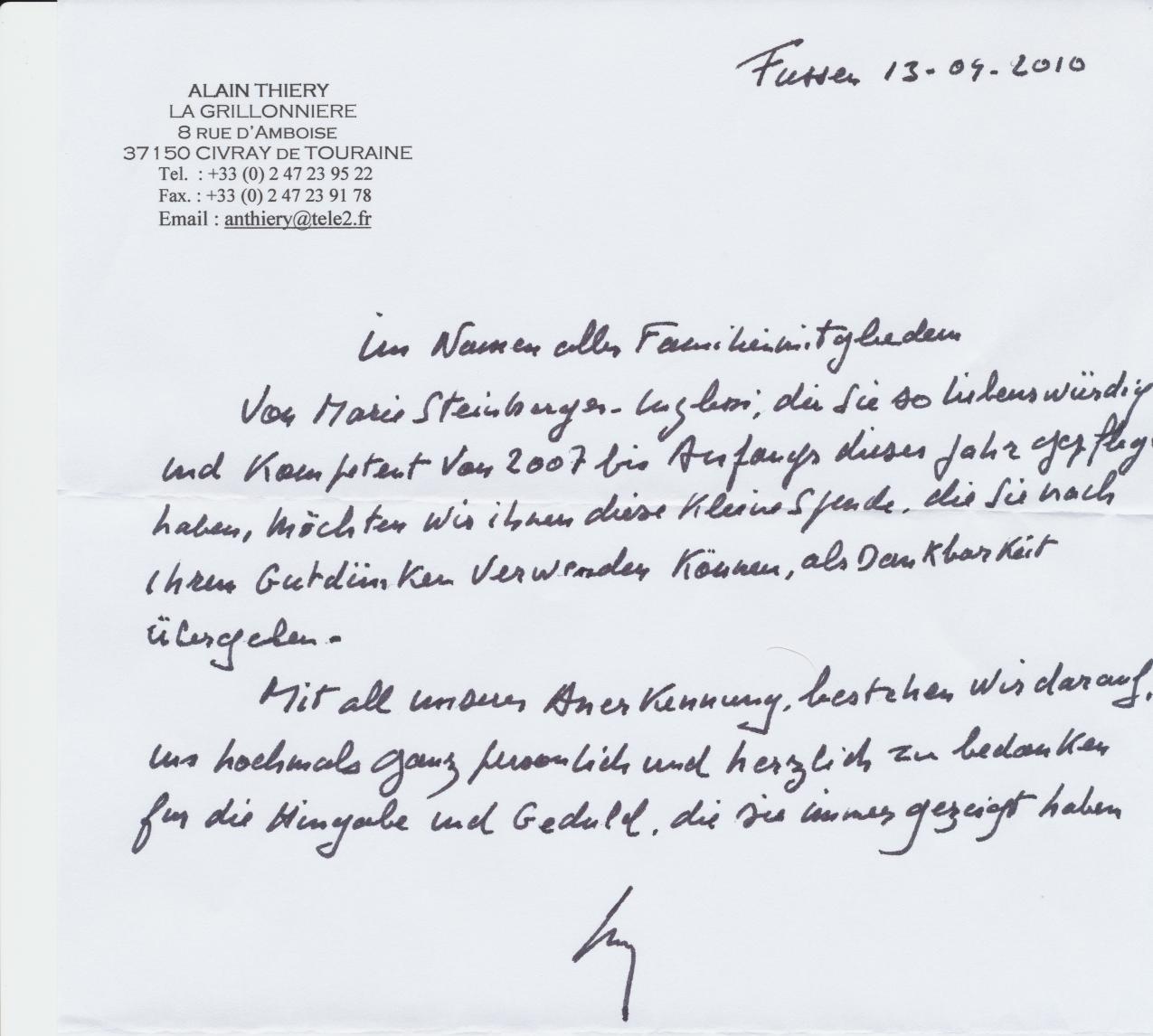 am Wochenende hatte ich keine Zeit, aber bevor ich es vergesse, möchte ich im Namen von meiner Mutter, Frau Veltl, Ihnen und allen Beteiligten ganz herzlich für die schöne Muttertagsfeier danken. Meine Mutter war ganz begeistert von den Musikeinlagen und der ganzen Gestaltung des Nachmittags. Es ist schön, dass Sie immer wieder solche Höhepunkte für die alten Herrschaften veranstalten. Vielen Dank und viele freundliche Grüße"